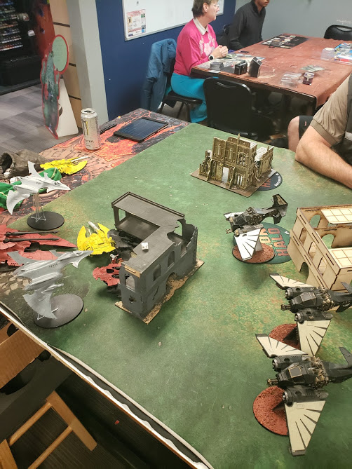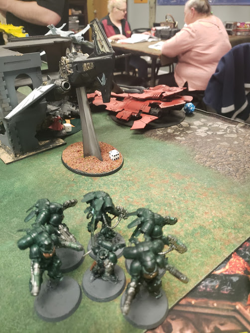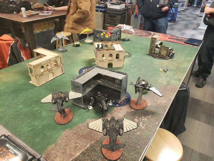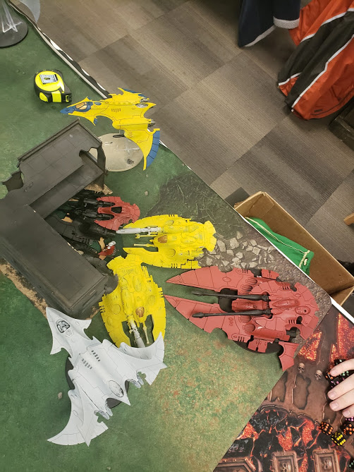 His turn was using his three living planes to lock out his entire deployment zone from my next squad of deep strikers. He killed off the Inceptor squad that was on the ground with his Exarchs and Night Spinners, the last wounds on my aircraft being torn off by the Farseer and indiscriminate throw away shooting. He then used the Scorpion to shoot my Phobos LT in the face for something in the lines of 30 damage.