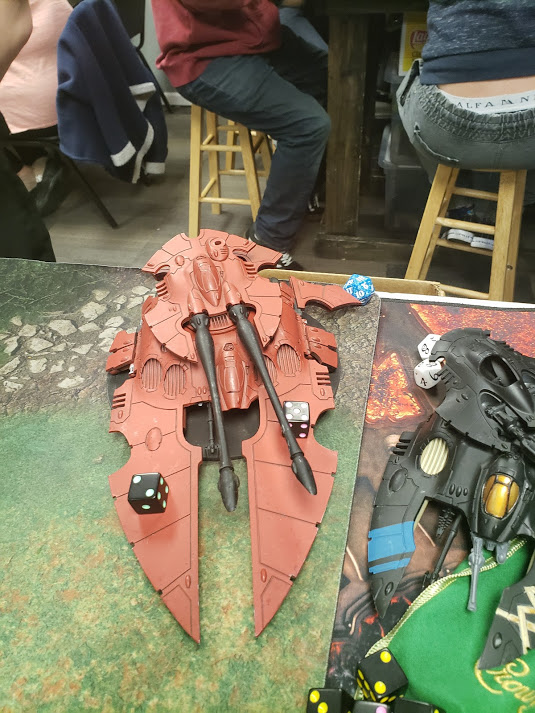 Dark Talons Strike! One threat down.His turn was flying forward, Jinxing my invul save aircraft, then lining up his flamer for auto hits on the exposed center aircraft. Another Wings prediction came true at this moment, his Wraithfighter shot 5 times into my Jinxed Dark Talon, wounded 5 times, and I failed every save taking 10 and crashing. The center aircraft was blown into tiny, itty-bitty pieces by the Scorpions relentless shooting. Then, in a move that gave me a breath of relief, he put his Exarchs into my Dark Shroud instead of my last plane, needing to use both to kill it thanks to the 4++ from Jink. His last Warp Hunter put its D6 auto hits of S10, -4 D6 dmg into the last plane. Rolling a 1, cp rerolling into another 1, doing only 2 damage onto the last Dark Talon. His line of sight shots went into snipers and scouts, low rolling the shots causing both to live.