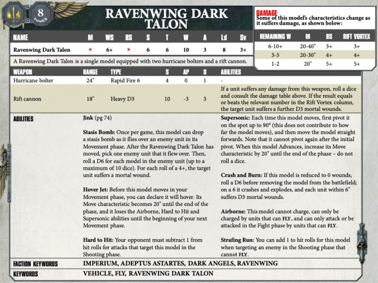 Dark Talons have a special place in my heart because my very first ever tournament game was against an army packing three of them, back in the wild west of early 8th. They're extremely cool models and have a very nice breadth of abilities that allow them to engage a broad array of targets. Sadly, they have some big problems, mostly stemming from their high cost. Prior to the rule of three, when they cost 160pts people were turning up to events with whole armies full of these, and in that context, the fact they could profitably engage with most targets made them way too good. Much like Flyrants, however, it turned out that once you can't saturate the table with them they were probably fine or close to it at the original cost. Comparing a 200pt Dark Talon to a Crimson Hunter Exarch or an Iron Hands Stormhawk is a real eyebrow-raiser, with the T6 10W statline being the most severe problem at the price. They were pretty scary the first time I faced them, but every time they've come up since I've just swatted them straight from the sky without worrying too much. The fact that they have to close to SMITE range to start doing their thing properly is also far from ideal against some armies