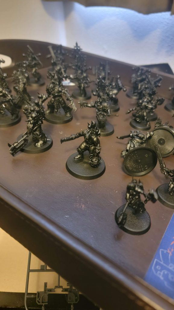 The test model turned out pretty radI wish I could lie to you and tell you that I was solely focused on completing this job, But because there was just so much to do alongside my school work, it felt like this process would never end. I had to find creative ways to distract myself from the tedious task of never-ending gold. I never truly respected how much trim was on these new corn berserker models, and do not get me wrong when I say that they are lovely sculpts. Games Workshop did a fantastic job on these new models; empowered by their chosen God, they are as tall as Primaris Space Marines.