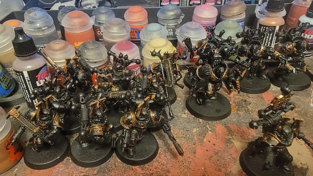 I have to paint 30 of these guys.I wish I had something fascinating to say at this moment. But you haven't heard from me in weeks, in what feels like almost a month, because I've been painting trim this entire time period. I started with the base of chaos black, and then I began to use different golds to find the kind of trim I would enjoy. I hadn't decided on a paint scheme right away, so I did paint up a master of executions in what I would see as my future idea. I had been reading about different world eaters groups, and there was a story about one who preferred to fight in space. When I think of space, I think of dark colors, and I think of black. I decided to go with black, with a red accent on their face using Mephiston Red and some color shifts for the dark edges.