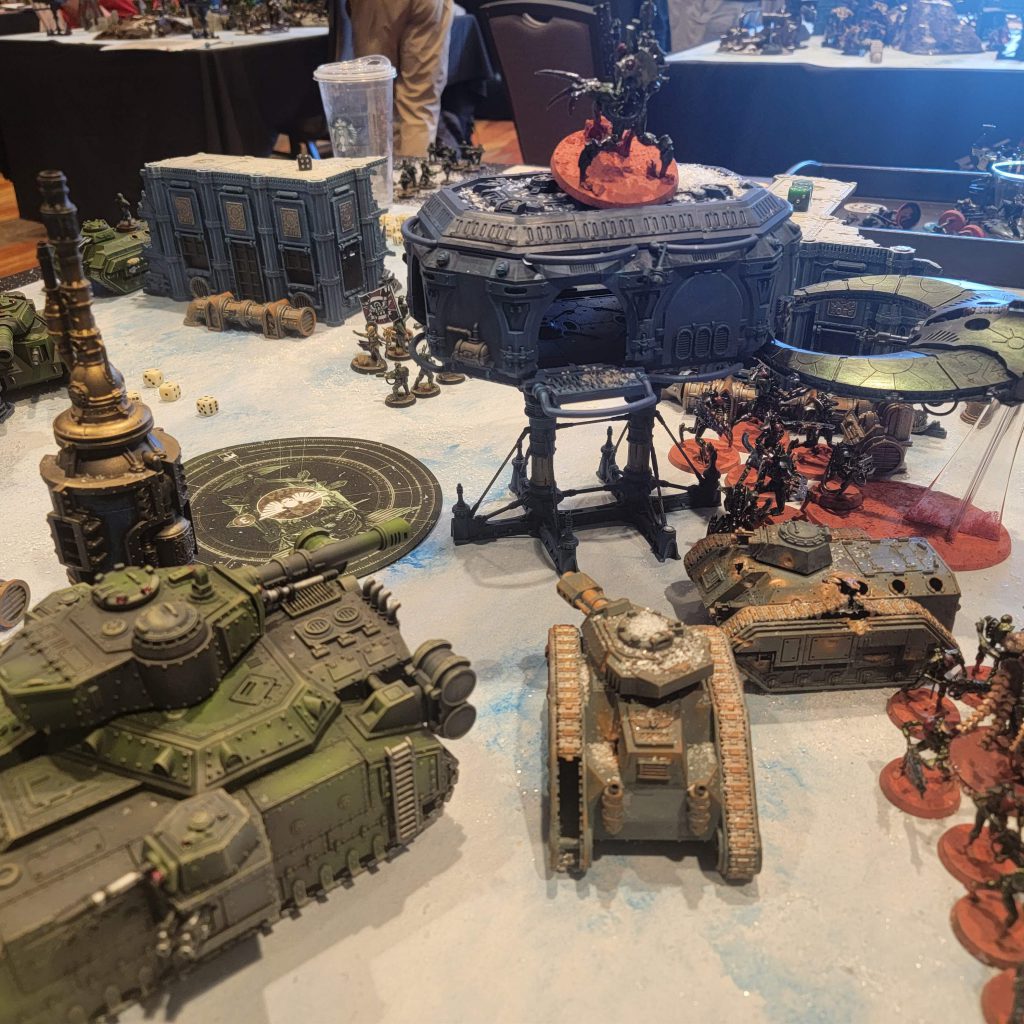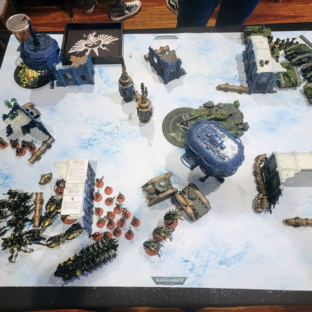 She told me I had been her champion throughout the event and had achieved many of the goals she had set for us. As a result, she granted me a boon. And the boon I chose was an opponent swap, pointing directly at Scott Horras "Heresy," playing his new Astra Militarum and, unfortunately for my chaos opponent, swapping him into JD and his Ultramarines. The Hemokan dynasty had finally arrived at its primary location. I was attempting to battle against this new human menace and their tremendous force of tanks. This mission was Cut Off the Head and it became an epic battle. Unfortunately, I didn't track the game as much as I should have, as I was incredibly focused on taking on this new opponent. I wanted to make sure I gave Scott the game he deserved and the game I wanted. On the map, you're going to see some ruined Leman Russ tanks that we played as obscuring, as well as these interesting blue buildings that we used as dense cover. Each area tends to have a type of ambiance. The only atmosphere in this room was the commander opening the door to the 42-degree weather, allowing our space to feel cold and thematic.