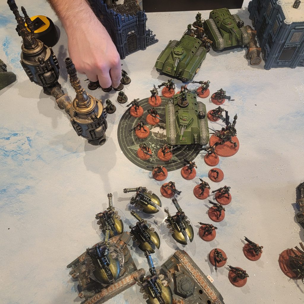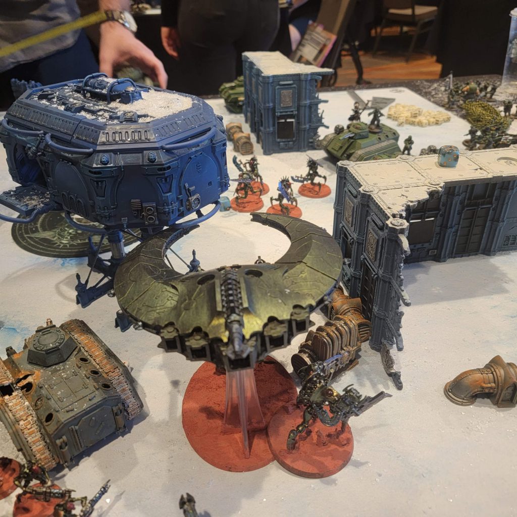 I didn't understand Scott's army's quickness until I saw it in action. He was playing armored assault, where his guys could get out of a transport after it moved. And armored superiority, where his tanks counted as multiple models when standing on objectives. His army upgrades via the crusade were also set up quite a bit like mine. Everything in his army that was a vehicle had a 6+ feel no pain. My army, at this point, also had a 6+ feel no pain on almost every unit. I knew this would be important when playing against his mass amount of three damage cannons. As we lined up and deployed, I took the time to hide just about as much as possible. I knew my plane would be annihilated if I did not go first. I took the time to spend a command point and hide my plane off the table, as well as more command points to hide my Skorpekh off, in preparation for the Dimensional Breach stratagem. A part of me thought going first was incredibly important, but another part of me knew that I needed to go second to benefit from a cover save for the entire game.And that is what happened. I predicted I would be going second, setting up my command protocols so that I would benefit from covering the entire game. The mission of this game was simple. You had to protect your characters while at the same time trying to do actions on the objectives in front of you. We had an objective in the top left-hand corner and another in the center. I did whatever I could at both locations to put pressure on these objectives to try and win the game. The challenge was that the action took an entire turn to complete, so accomplishing it would be very hard in this environment of bullets. The game started about as you would expect, with Scott pressuring his Baneblade up the middle and downing my Doomsday Arc first thing. I tried to set it out in shooting to bait out anti-tank shooting using the Quantum Shielding but could not make enough saves as his Baneblade tore the vehicle apart. Scotts' return fire was weak as he tried to knock down my warrior brick with a wall of shooting, falling a bit short and leaving commands squads, his only infantry characters that could complete the mission, exposed in the center of the table.