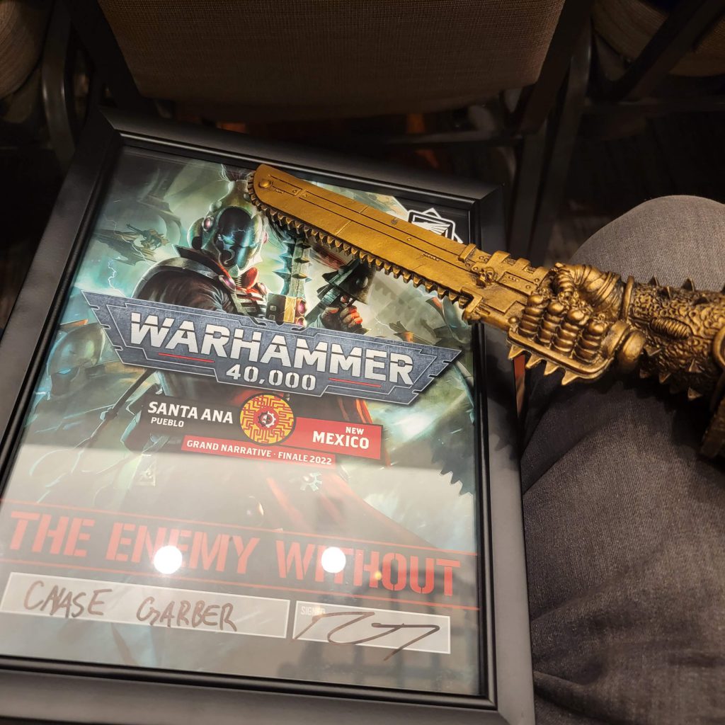 "I'm a NECRON!" Sweet VictoryWith all of the games completed and my hard work done, I could sit down and relax in the main hall, where we would soon have a reward ceremony. As I'm sure you have seen throughout the week, the goon hammer staff did very well with this event. We won two painting awards, as well as two narrative awards. I won the best interloper, known as the enemy without, and Pendulum won the Living Saint, the Best Imperium player. Winning this award was really excellent for me because I haven't done much with 40K for some time, at least since the pandemic started. So being able to do my part in this narrative event and get recognition was great. It was a tough competition as well, as there was a Ynnari player on my team who did just about as well as I did. Though thanks to my game against FromTheShire, I was able to complete the "Kill the enemy Psyker" objective we were given, while he had an opponent with no Psykers, giving me the edge and the win.