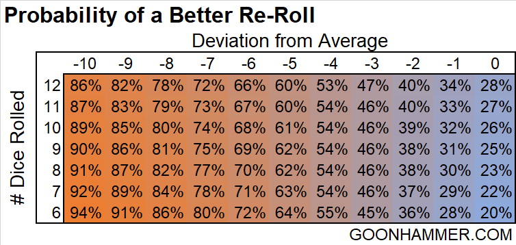 One thing that the mean doesn't take into account is the influence that Farseers have on the distribution. Being able to replace the worse dice in the pool with unmodified sixes is extremely powerful. The challenge with integrating the effect of Farseers is that the number of dice to be modified is heavily dependent on the flow of the game. If the opponent murders all of the Farseers in turn one then they will have a minimal influence. On the other hand if Farseers are kept alive and modify one die roll each turn then their influence is significant. To address this my recommendation is that you remove a number of dice from the pool equal to how many times you expect a Farseer to influence the results, starting with the lowest result. Then look at the average of this new pool and apply the chart to see if a re-roll is appropriate.Thanks for reading! If you have any questions or comments feel free to drop us a note in the Comments below or email us at contact@goonhammer.com. That’s also the best way to suggest topics for future articles.