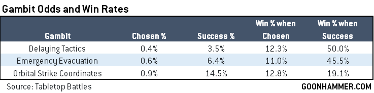 When it comes down to it, Gambits just don't come up very often - only in 1.9% of games played in our Leviathan GT sample, or 287 games in our sample. Of those, players only succeeded 10% of the time, in 28 games. Of the options, Orbital Strike Coordinates was the most popular by far, being the one that's almost always achievable - Delaying Tactics and Evacuation may not even be possible depending on the army states - though as a result, it was also the least likely to win the game for its players. That's the other rub - players only won off gambits about 12% of the time, meaning that in our sample of more than 15 thousand games, only 7 were won by a player who succeeded at a Gambit. Just as noteworthy are the 28 or so games where a player chose a Gambit and won despite it not being successful - how much of that was dramatic turnaround vs. a misreading of the board state would be fascinating to know.