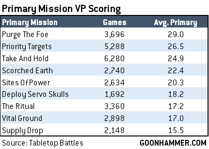 Currently, players are scoring an average of 22.5 points for primary in Leviathan GT missions. I don't have winners and losers data yet, but we'll add that soon. Note that while we aren't breaking these out by mission rule, we can generally assume at the moment that most of these games follow the basic mission structure laid out by Games Workshop, i.e. using their Missions A-O recommendations, so The Ritual will also be a mission that tends to use the Scrambler Fields Mission Rule.Anyways, looking at the average we can see that missions range from very generous - Purge the Foe rewards 4 VP at the end of each battle round for killing one enemy unit, and another 4 VP for killing more than the opponent did. Add that to 4 VP for hold one and you've got a mission where it's easy even in a loss to score 8 VP per round.