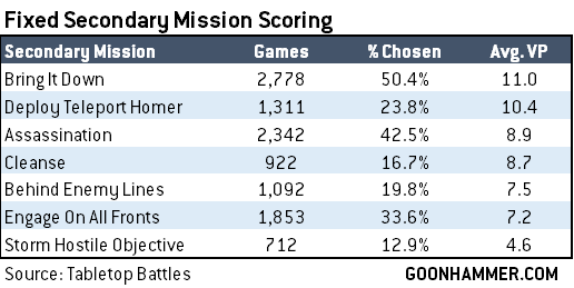 On the whole, Fixed secondary players tend to score worse and perform worse than tactical - on average players choosing Fixed missions score just under 2 points per game less than players on Tactical missions, and this translates to an overall win rate of 46% for Fixed missions players vs. 48.3% for Tactical (note that ties are not counted as wins in our stats).