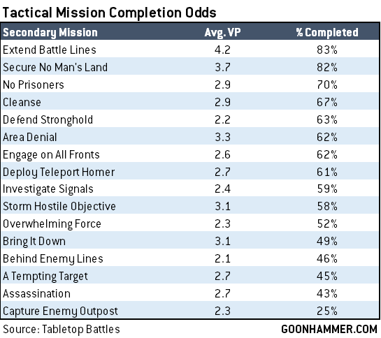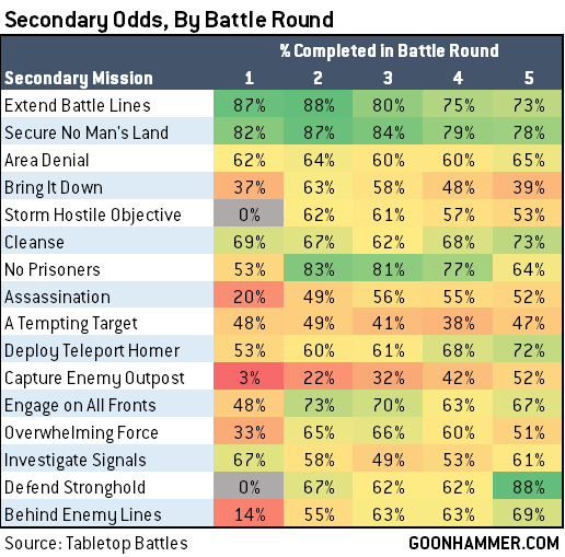 So here we can see that Extend Battle Lines and Secure No Man's Land basically stay sure things throughout the game - these, along with Investigate Signals and Cleanse - are the secondary missions you want to draw turn 1, if possible. No Prisoners is worse on the first battle round, when your targets are far away and may be out of sight, particularly if you went first, and likewise Engage on All Fronts, Assassination, Overwhelming Force, and Bring it Down all improve dramatically after round 1 is over, and may even dip at the end of the game as targets become less plentiful and your forces are depleted.