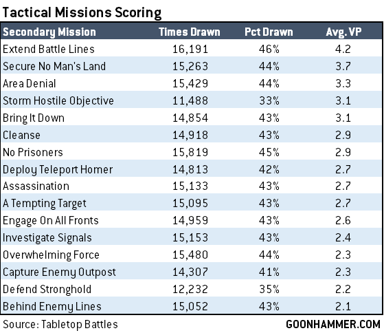 The data in this week's sample comes from data collected in Tabletop Battles, Goonhammer's app for tracking games of Warhammer 40k (and now AoS!). If you haven't downloaded it yet, I'd strongly recommend you give it a look - it's just the best way to play 40k. For this sample we're using data from 18,790 games played using the Leviathan GT pack recorded in the Tabletop Battles app since the pack's release. In this article, we'll be focusing on secondary missions and scoring.