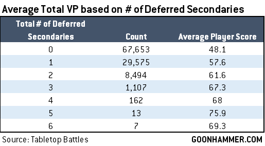 Let's start off with a quick definition: A Deferred Secondary is one which you score in a round later than the one in which it was drawn. If I draw something turn 1 and score it two turns later? That's a Deferred Secondary. Ok, got that? Great. Now let's look at a stat: