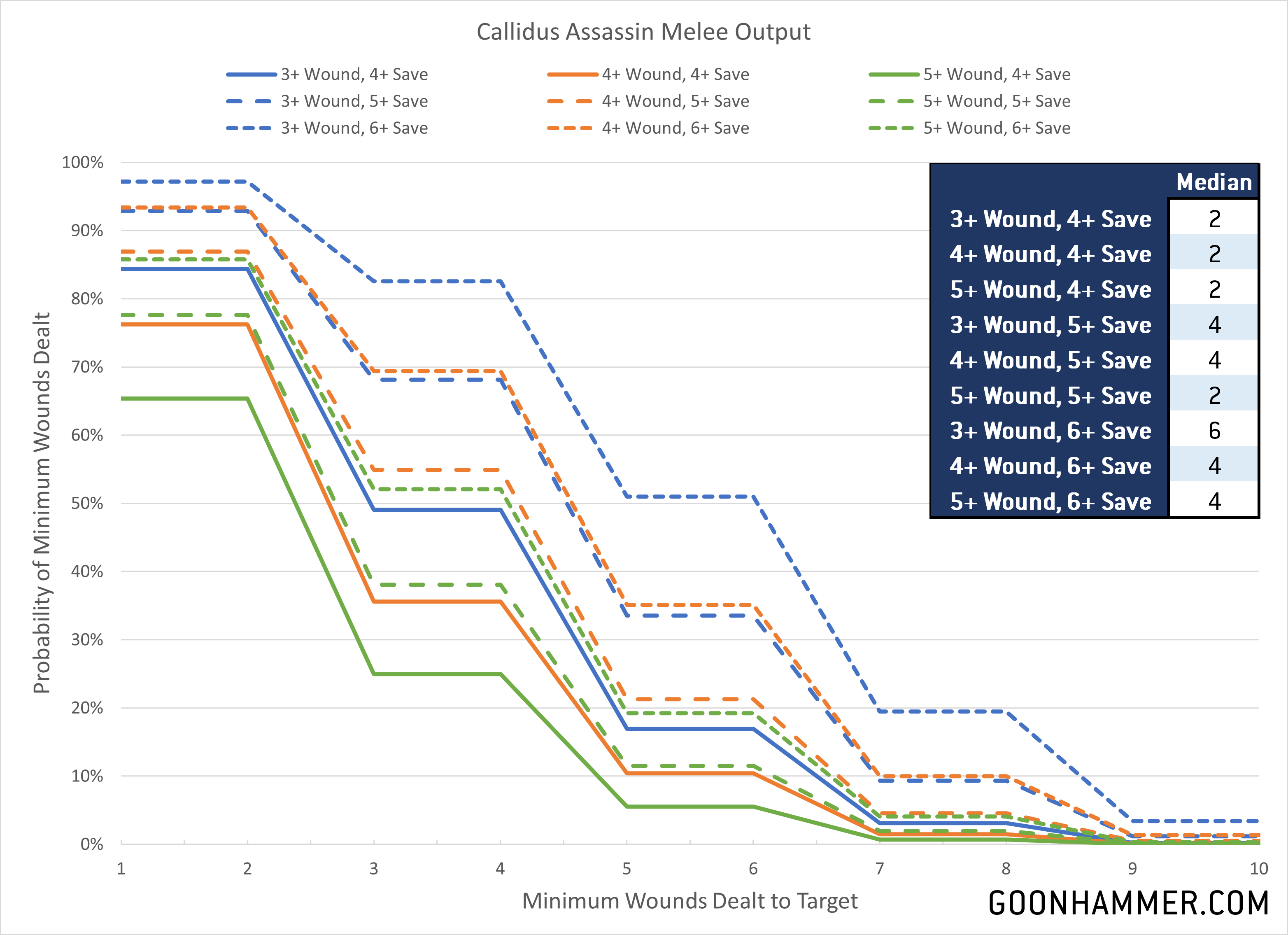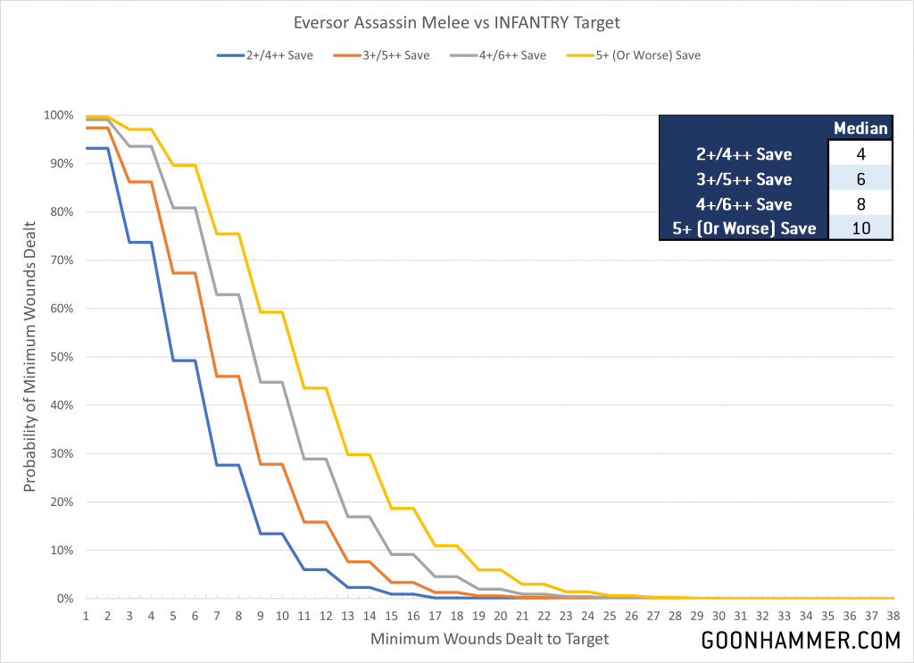 Eversor Assassins are basically cyberpsychos from Cyberpunk 2020 with more skulls and less of a regard for human life. These juiced up killing machines aren't so much assassins as they are ambulatory terror weapons, and their primary purpose is to kill the target, anyone nearby, and probably anyone who those people met. They also explode when they die, which is a nice touch. In the game they're armed with pistols and melee weapons which features a wonderful combination of [ANTI-INFANTRY 3+] and [SUSTAINED HITS 3] for the potential to absolutely explode with damage. The graphs below reflect this, with the melee profile able to inflict a median of up to 10 wounds against poorly armored targets.