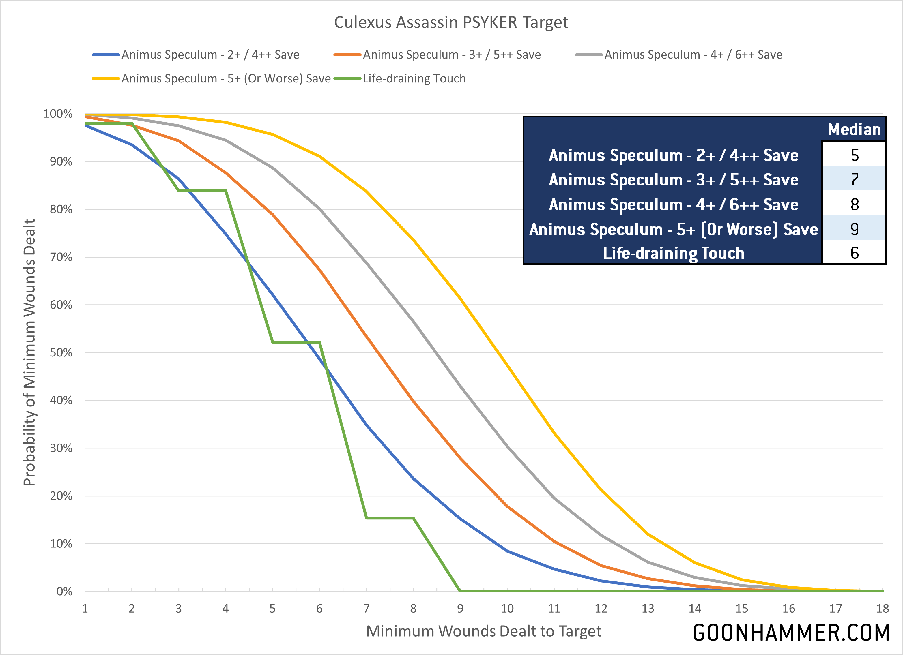 The Culexus kills psykers. That's it. It exists to pop up, murder a Psyker, and then get killed. It is extremely well suited for this task, featuring a ranged attack that can potentially deal 18 wounds and the ability to appear anywhere on the battlefield that's more than 3" away from an enemy unit. The chart below shows just how unpleasant the output of this thing is, reliably dealing a median of 6 woulds in melee and from 5 to 9 wounds depending on the Save characteristic at range. That's enough to reliably killa Farseer in one turn.