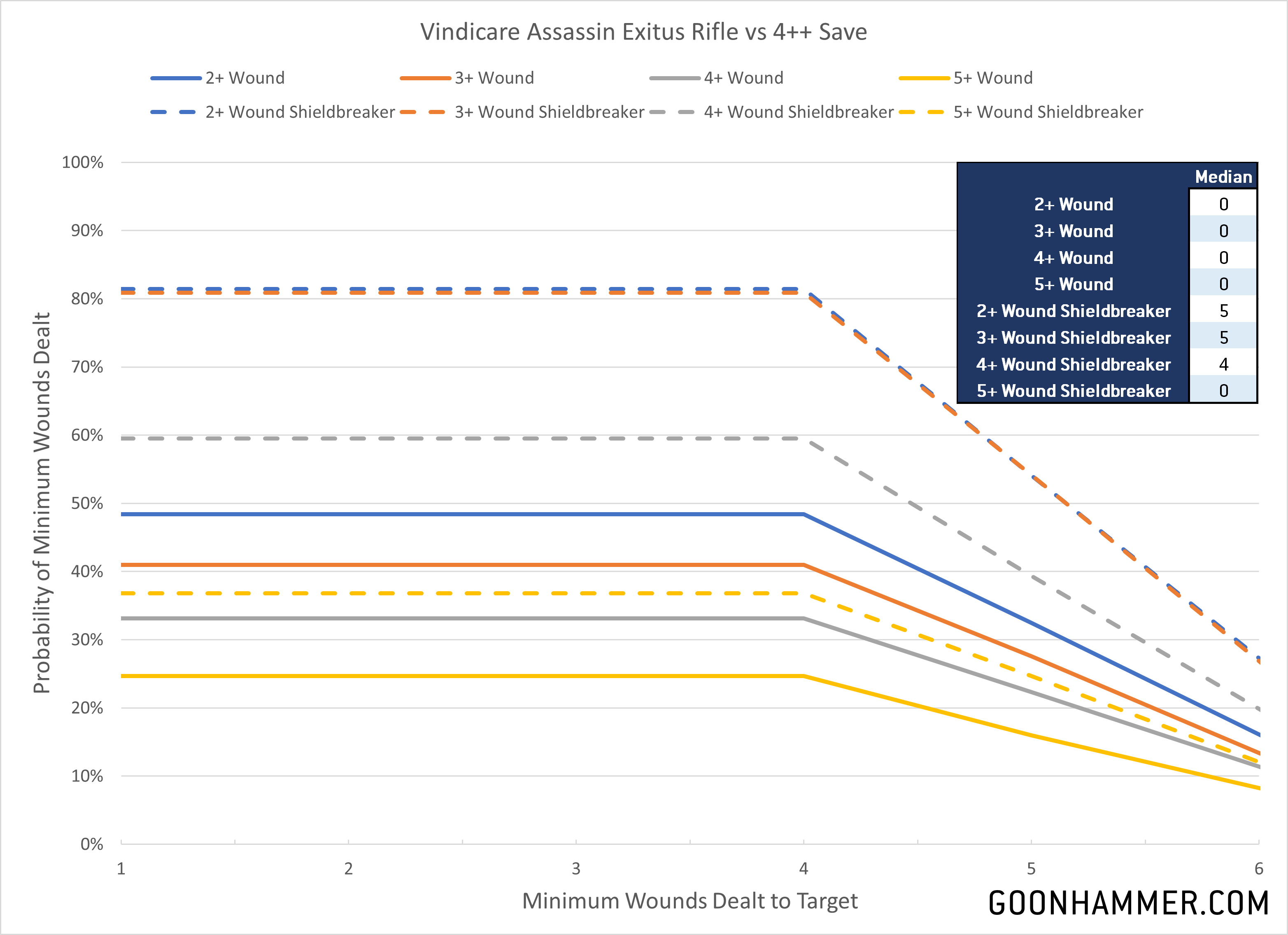 In the lore Vindicare Assassins are the ultimate sniper, able to stay in impossible position for days or weeks until the target presents itself for the perfect shot. On the tabletop they are specialized killers, ideally positioned to take out Lone Operatives and other important figures if they present themselves. Particularly notable is the Shieldbreaker ability, which once per battle gives the player the chance to cause a Critical Wound on any successful Wound roll (with a +1 to Wound to boot). Given that the exitus rifle has [DEVASTATING WOUNDS] this is pretty nasty. The chart below reflects that, showing how 80% of the time the attack will inflict at least 4 mortal wounds on a target that has a Toughness characteristic of 7 or less. It also shows the lack of reliability that a single shot threat has against targets with an invulnerable save like a Space Marine Captain; more often than not the attack doesn't do anything.