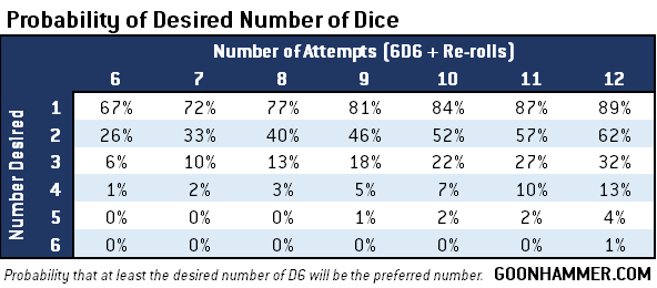 The chart above shows the probability of getting at least the desired number of Strands of Fate dice to show up with your desired result. With six dice you have a 2 in 3 chance of getting at least one result. Start using re-rolls courtesy of Farseers to get more attempts and the probability increases, but even if you bring six Farseers and re-roll every die there's still a roughly 1 in 10 chance that your desired result won't show up. The good news is that at least you'll know in the Command phase.