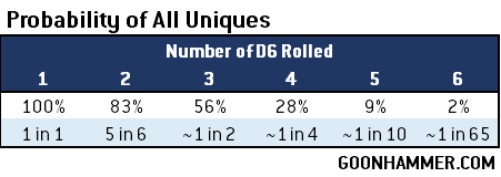 If every unit in the army has the HARLEQUIN keyword and is performing the same saedath (or is UNALIGNED) then the Aeldari player gains access to the Luck of the Laughing God ability. This ability grants the player with between 1 and 4 re-rolls each battle round. The number of re-rolls depends on the size of the battle. These re-rolls can be used on hit rolls, wound rolls, damage rolls, saving throws, or Advance rolls. The Aeldari player can also gain additional re-rolls by rolling up to six D6. If every value is unique then the player gains as many re-rolls as they rolled D6. If there is a match then they only get the guaranteed ones.To figure out the probability that you'll get the desired number of extra re-rolls, you can use the chart below. Up to 3 dice will get you extra re-rolls the majority of the time, but things get precarious from there. The probability of getting 5 unique values on 5 dice is roughly the same as an Aeldari player not getting the roll they want even with 6 re-rolls. Fate is fickle like that.
