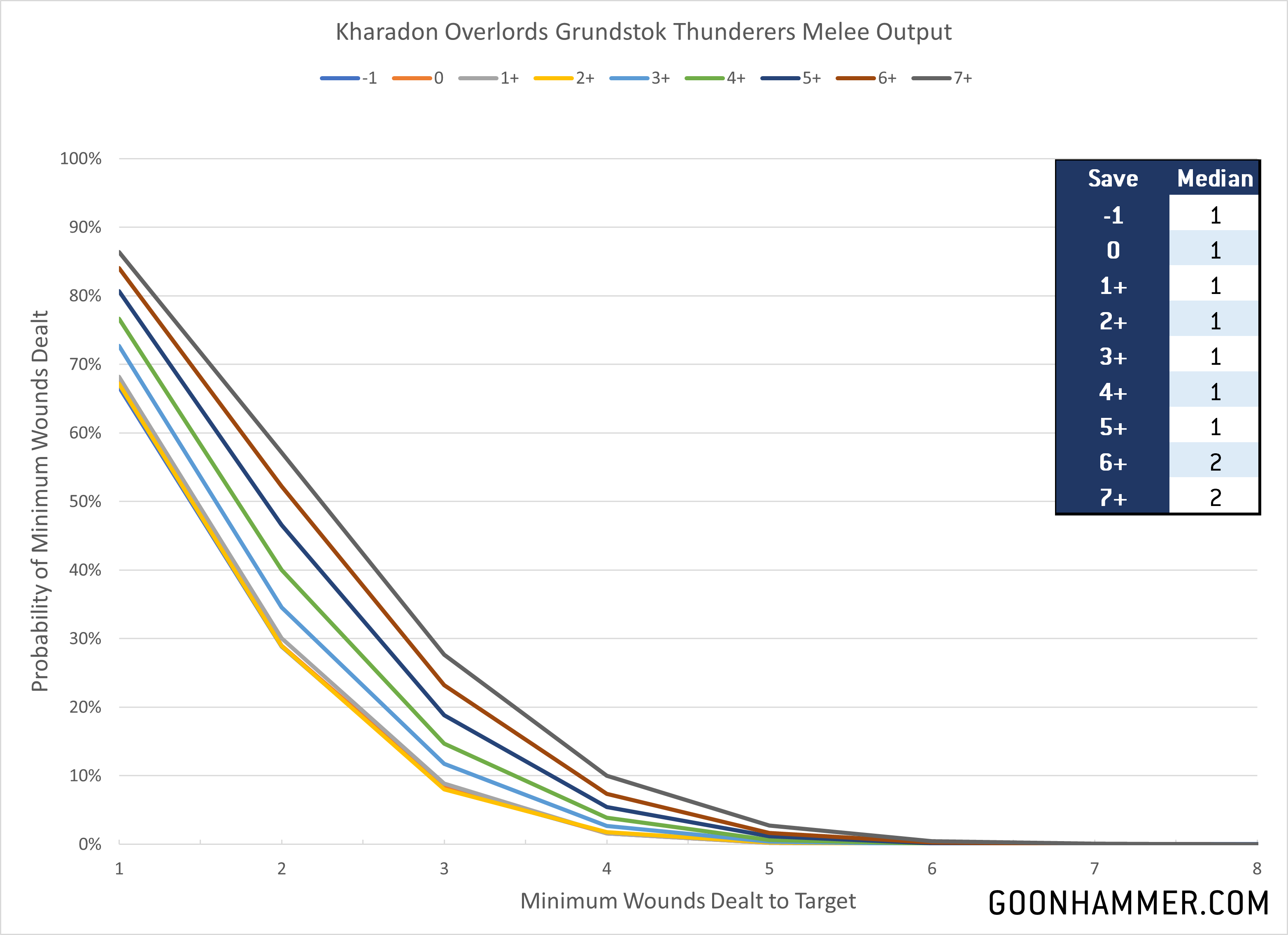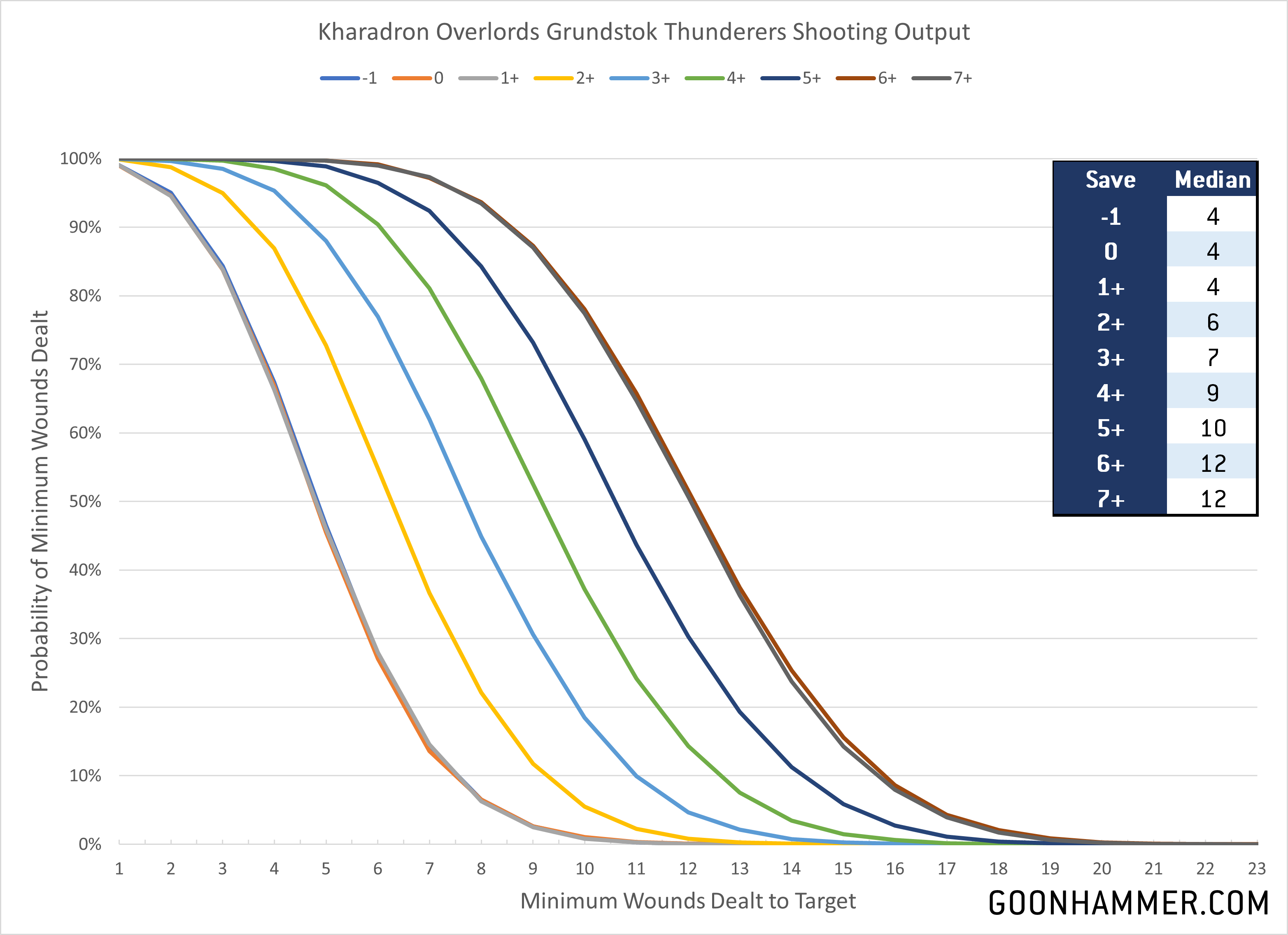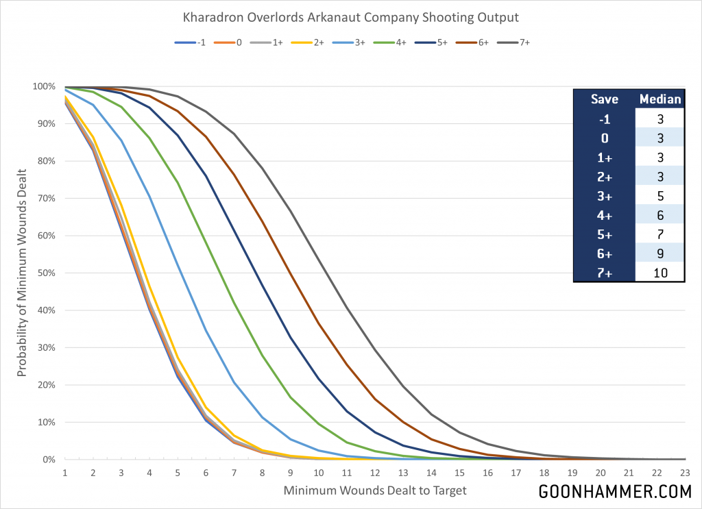 We quickly see that the Grundstok Thunderers have a decisive advantage over the Arkanaut Company in shooting across all Save characteristics, and ranges from 20% to 40% more wounds. Against every Save characteristic except for a 7+ the Grunstok Thunderers make up for their points difference.