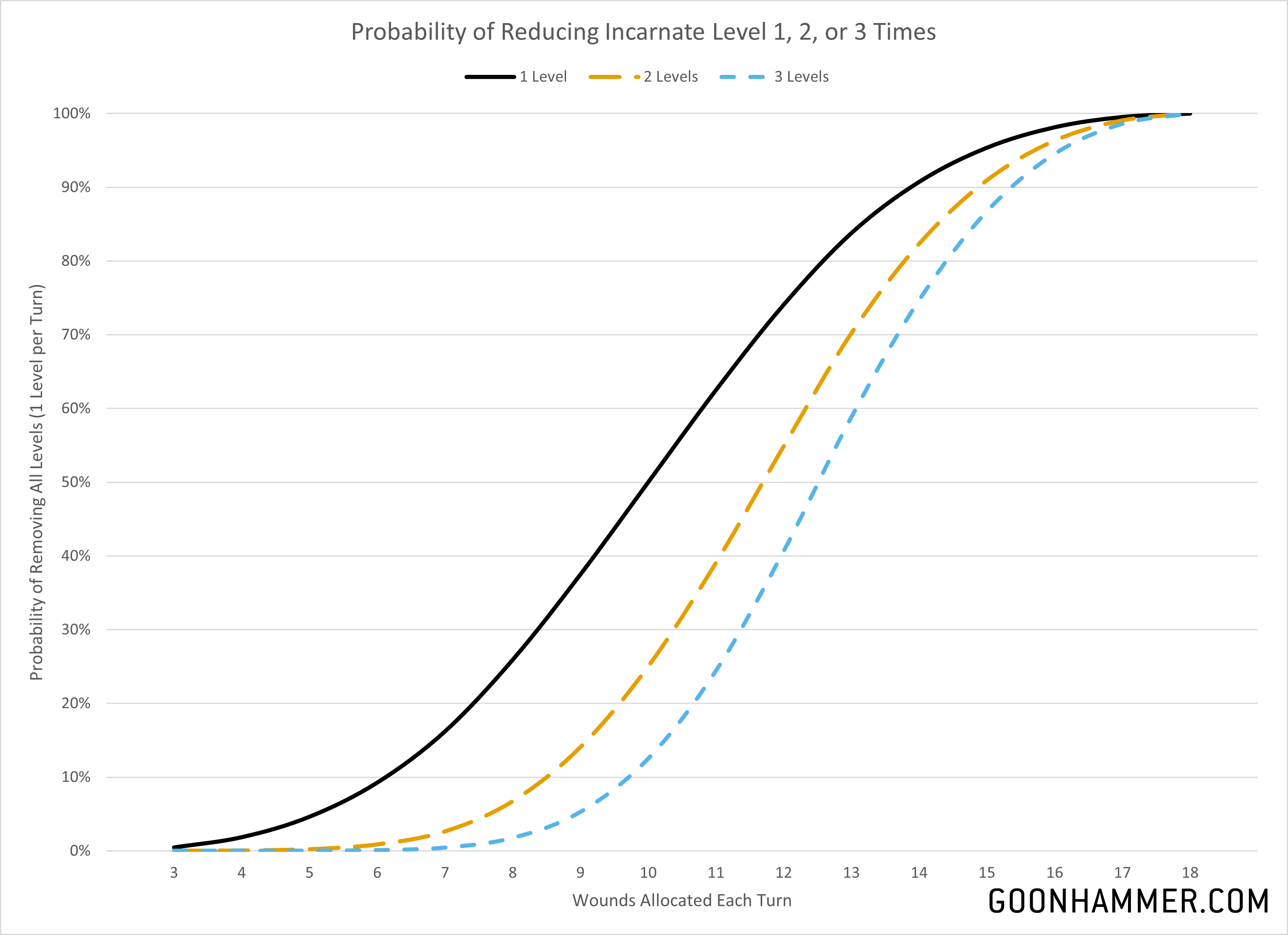 Incarnates do not take wounds like a regular unit. Instead they have a series of states from level 0 (dead) to level 3 (really nasty). When they arrive on the battlefield they start at level 2. States can go up or down due to a variety of rules and effects, but the most common way to decrease an incarnate's level is by attacking it. Wounds are allocated to the incarnate like any other model, but the unit cannot be slain. Instead during the Battleshock phase the player rolls 3D6; if the result is equal to or less than the number of wounds inflicted then the incarnate goes down a level. Incarnates are removed from play when they hit level 0, and can never go above level 3.The math around incarnates is fairly interesting, because as so long as the unit has suffered fewer than 18 wounds there's a chance there will be no effect. The raw probability of the target losing a level is simply the chance of rolling equal to or under the target on 3D6, but the requirement that the success occur over multiple phases means you have to consider the cumulative probability of multiple successes. This is accomplished by multiplying the respective probabilities together. For example, if the probability of succeeding once is 50%, then the probability of exceeding twice is 25%. The chart below shows the probability curves to kill an incarnate at state levels of 1 through 3 assuming a given number of wounds is applied each turn. For example, if 10 wounds is applied to an incarnate each turn then you have a 50% chance of reducing it 1 level, 25% chance of reducing it two levels in two turns, and a 13% chance of reducing it three levels in three turns. You can click the image below to expand it.