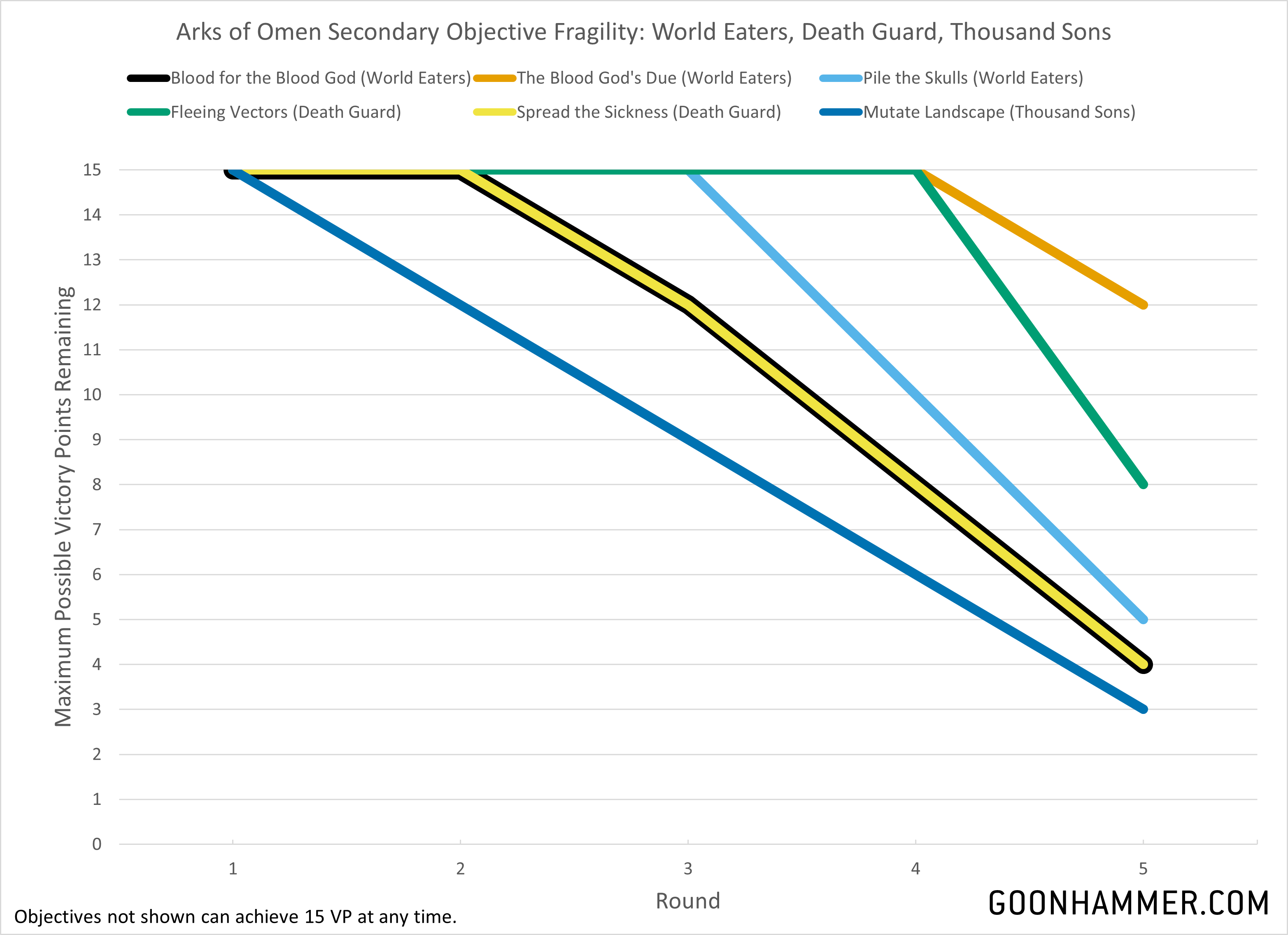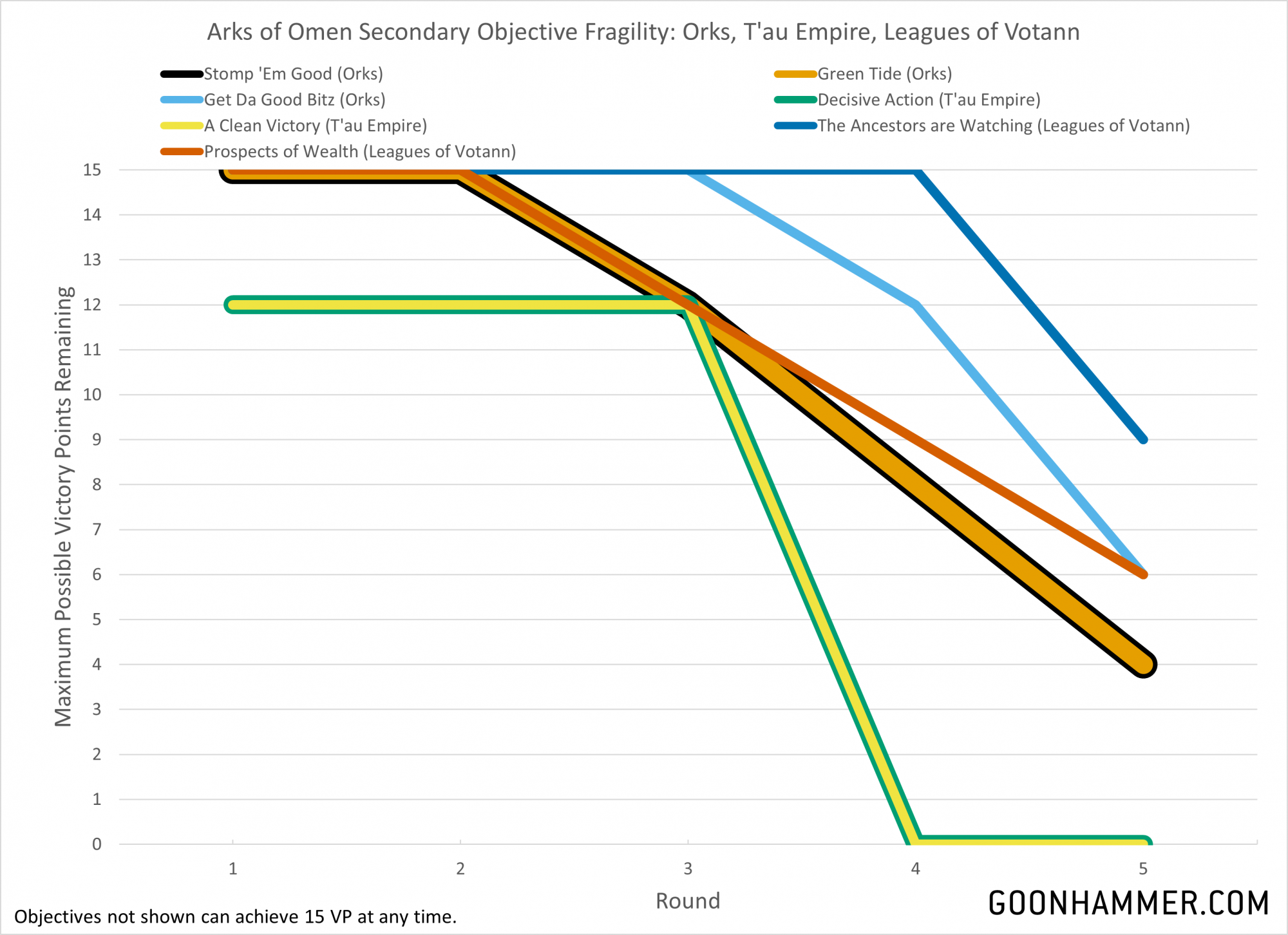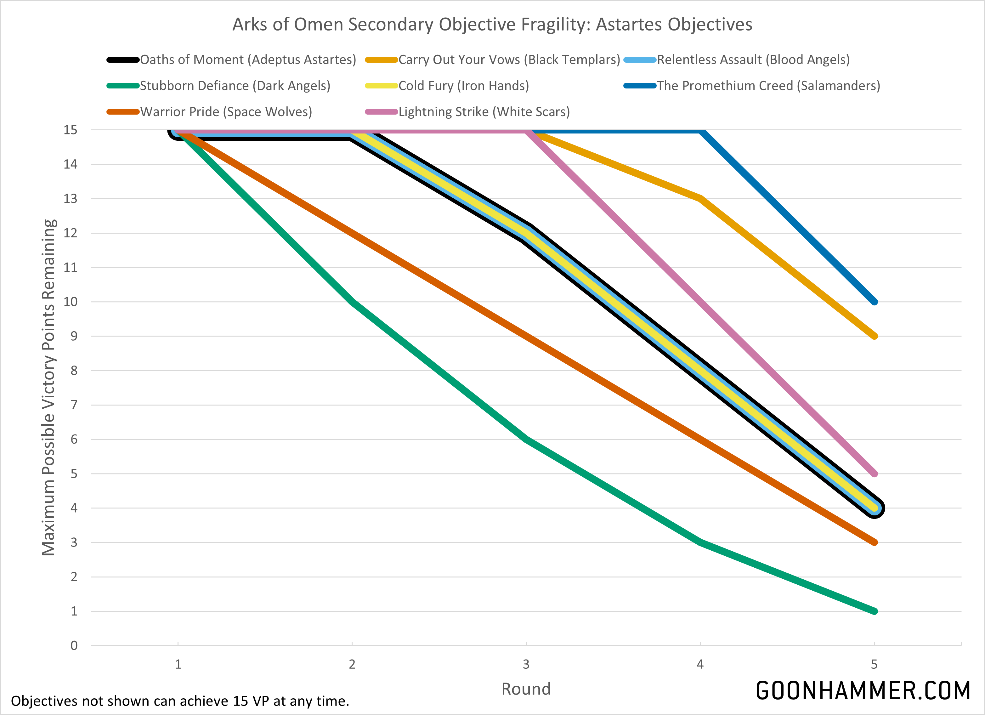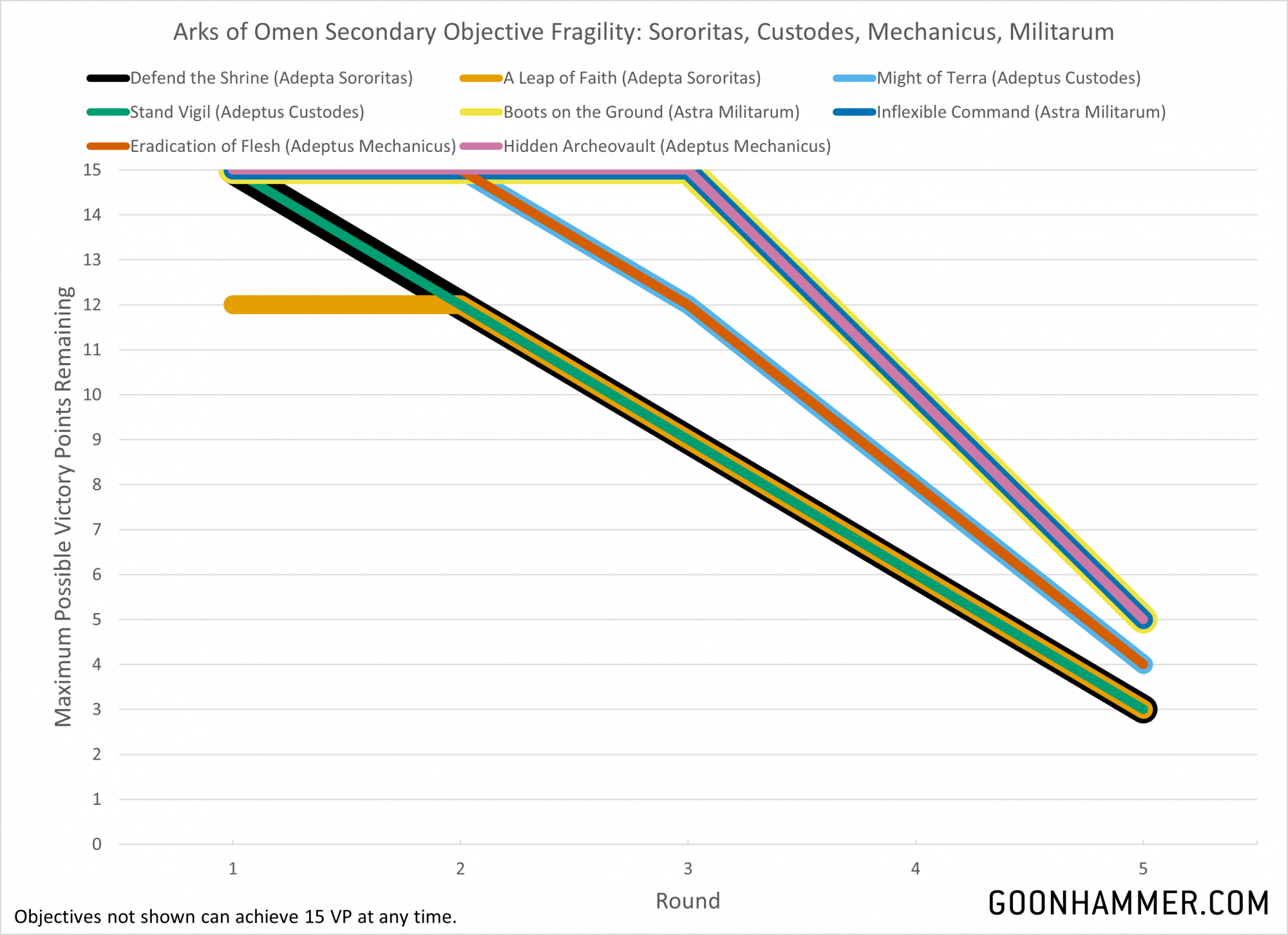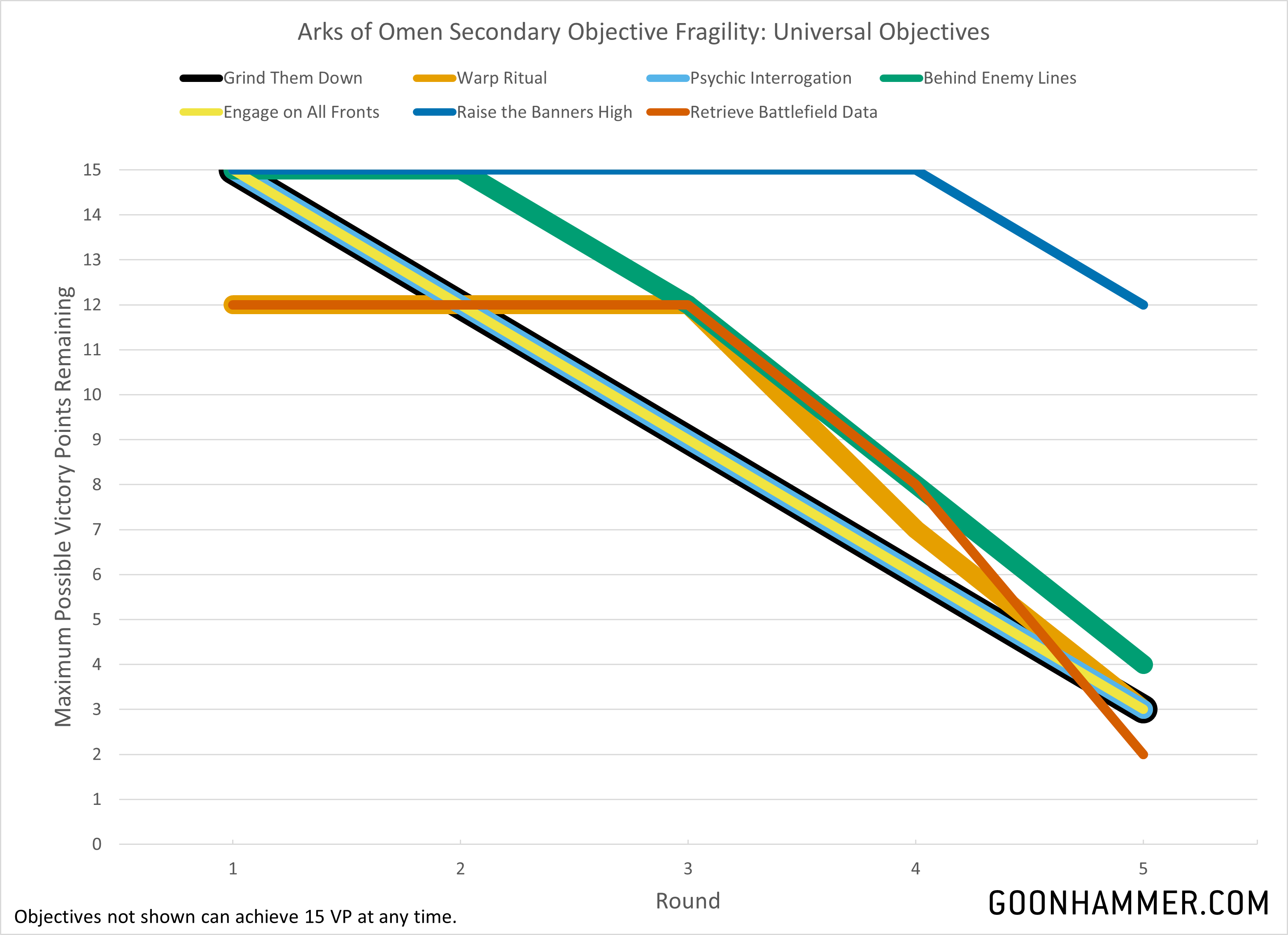 Last week I did a deep dive into the Secondary Objectives of Arks of Omen, and one of the bits of information that Rob requested was that I add the minimum rounds required to achieve the maximum potential points for each objective. During the course of running the numbers it occurred to me that with a bit more analysis we could look at each objective in the context of fragility, meaning how susceptible a given secondary is when things go wrong. For example Grind Them Down requires you to succeed every turn in order to maximize VP; if you miss a single round then you're capped in what you can achieve. Secondaries like that ride on what I call the Line of Intolerance due to their unforgiving nature. On the other hand many Purge the Enemy secondaries like Assassination and Bring It Down have no limitations on when a player can achieve 15 VP, so long as the opponent has enough targets. This means that Grind Them Down is more fragile than an appropriately chosen Purge the Enemy secondary. Of the 96 secondary objectives only 26 (around 27%) are completely resilient.