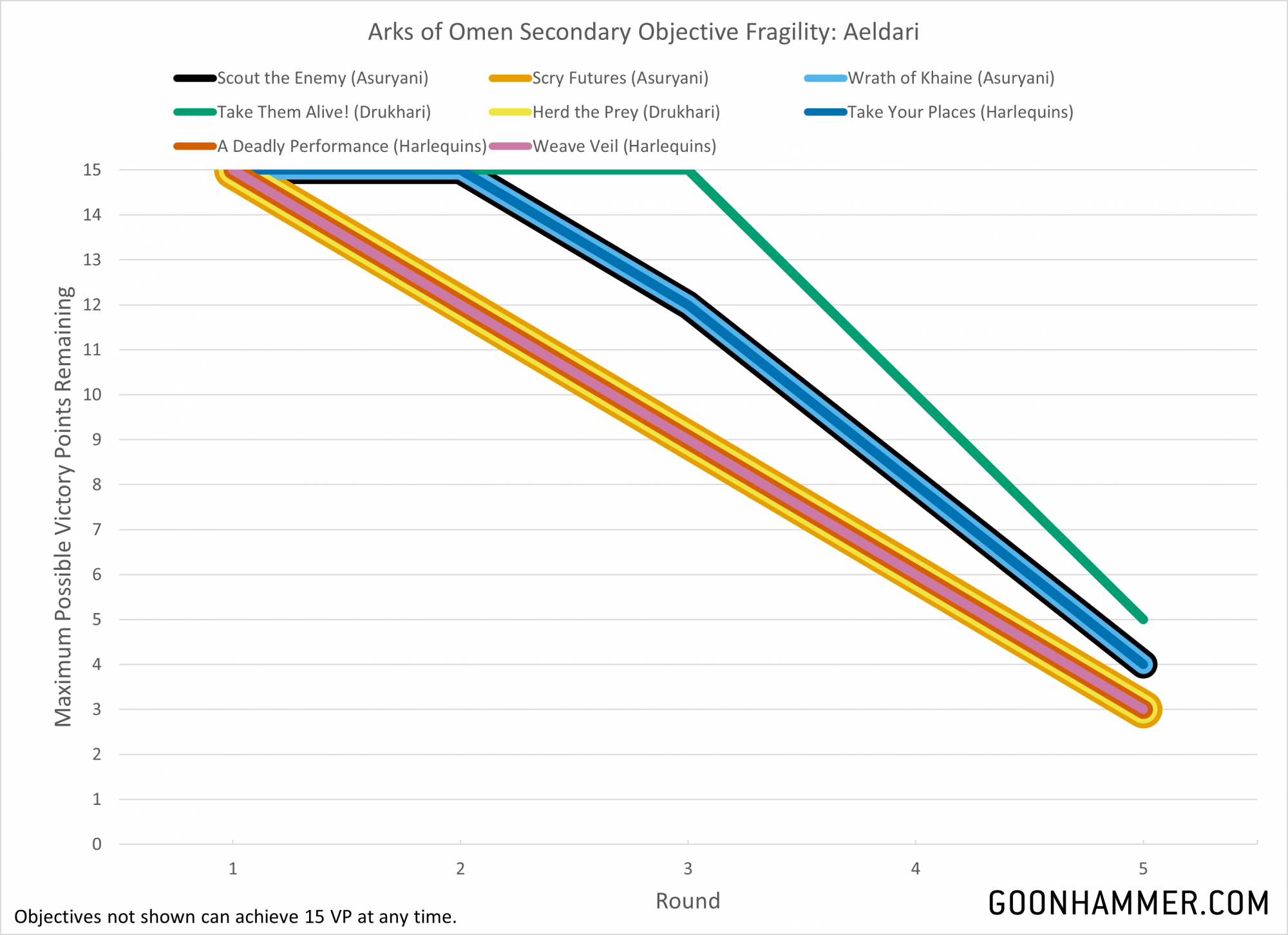 The Harlequin faction secondaries are the most fragile in Arks of Omen, with two riding the Line of Intolerance due to only being able to generate 3 VP (and only 3 VP) per turn. Asuryani fair a little better with Scout the Enemy in particular seeming accessible. Fear and Terror help the Drukhari since it's theoretically possible to max out in any turn, but Herd the Prey can be challenging since at best you can score 3 VP per turn unless your opponent is actively avoiding putting a unit wholly within a table quarter.