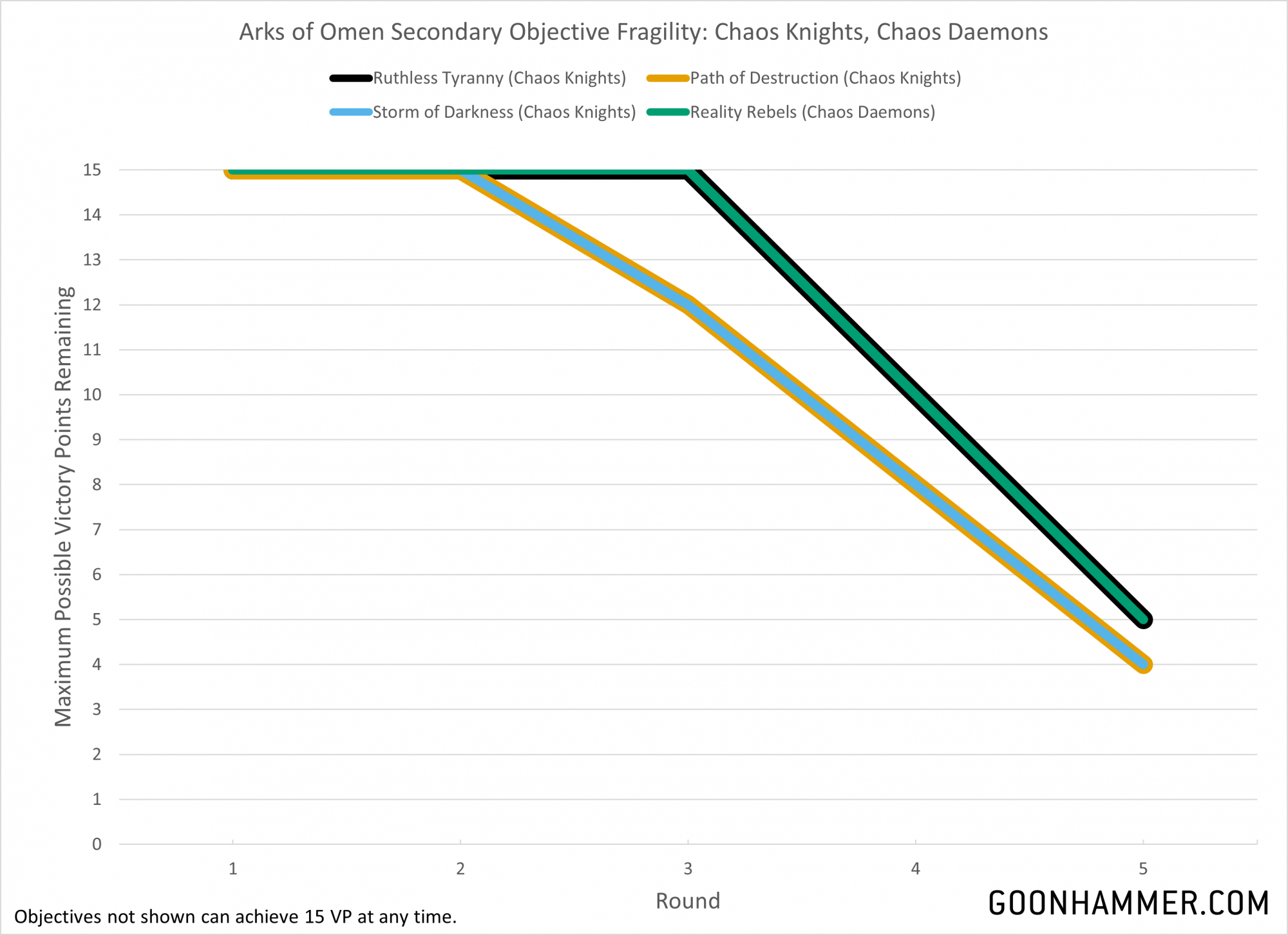 Chaos Knights and Chaos Daemons both have access to multiple robust secondaries, with the worst option for both armies still allowing a possible 12 VP by round 3. For Chaos Knights Storm of Darkness is a viable source of victory points so long as the Knight performing the action survives. While Reality Rebels lends itself to a horde army that can blanket the board, Chaos Daemons also benefit from Despoilers of Reality which allows multiple INFANTRY units to perform an action that's worth 4 VP. The synergy there seems particularly nice.