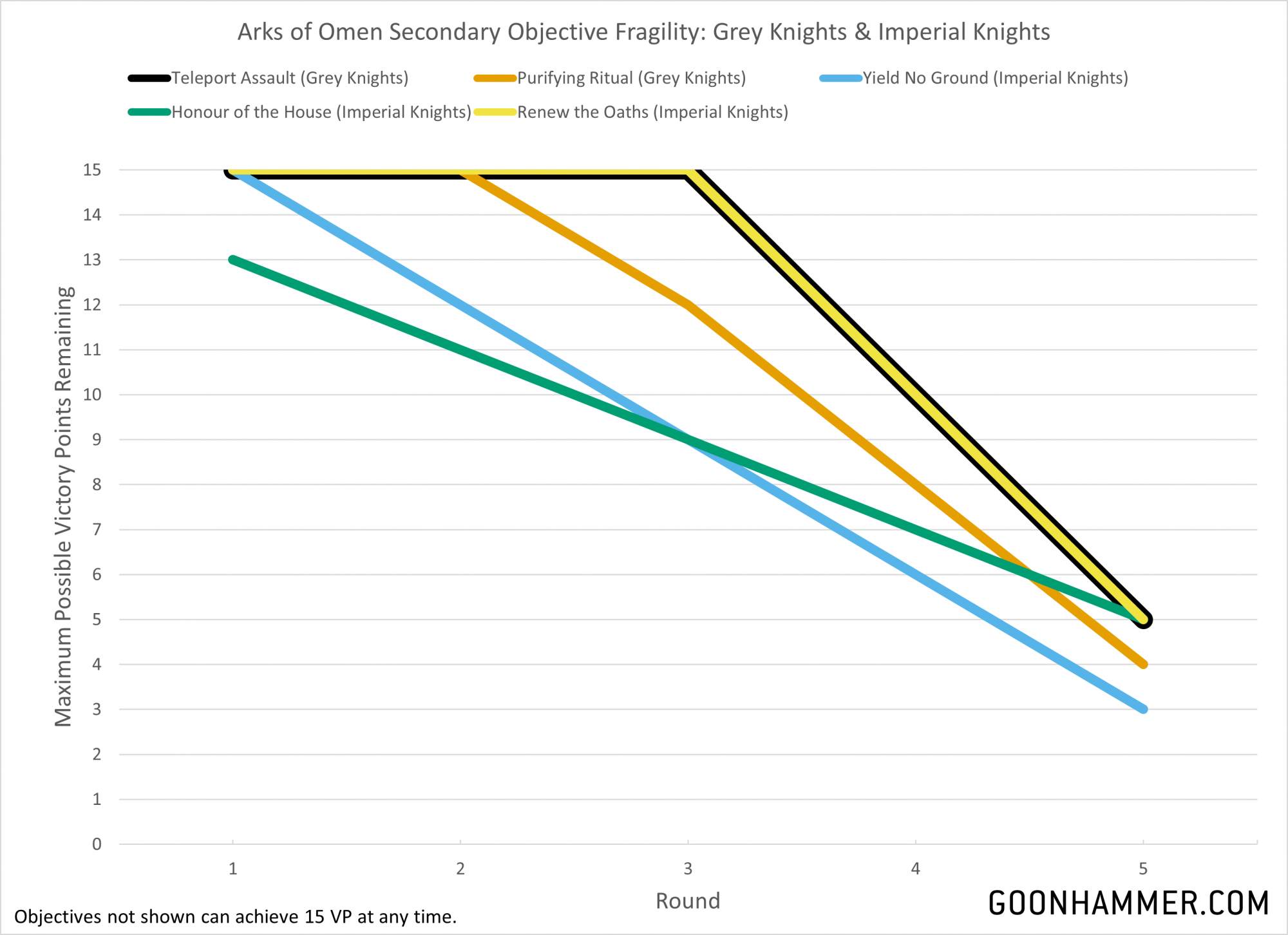 Curiously the Imperial Knights don't have any faction-specific secondaries that can be maxed out in the final round while Honour of the House suffers from being capped at 13 VP. Grey Knights fare a little better, with all of their secondaries over the Line of Intolerance and Destroy the Daemon being maximizable at any round so long as the GK player is lucky enough to be facing daemons. Note that Grey Knights do not possess the ADEPTUS ASTARTES keyword and may not use the Space Marine secondaries.