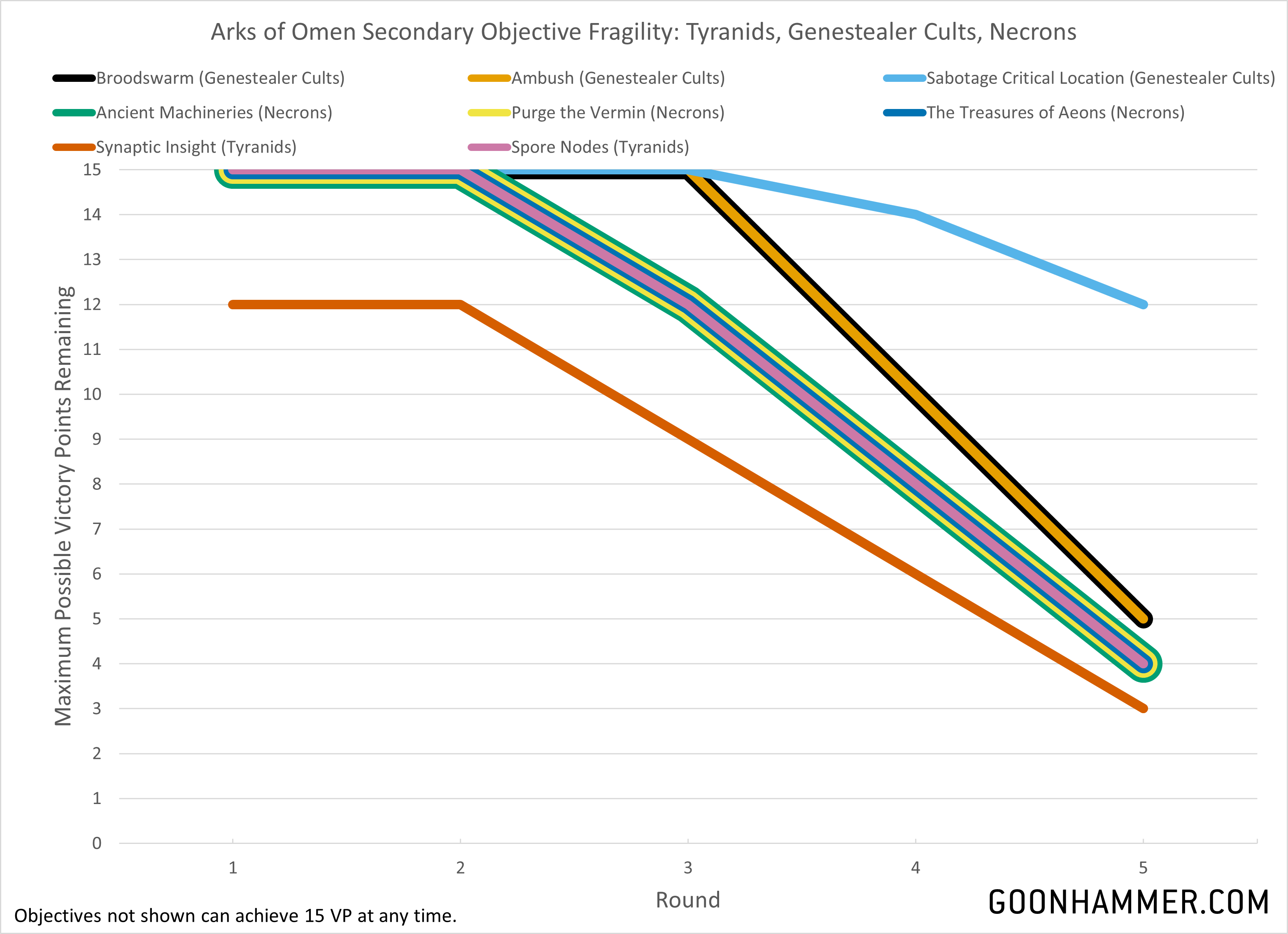 Tyranids get it particularly rough with Synaptic Insight falling below the Line of Intolerance thanks to the combination of a 12 VP cap and a limit of scoring 3 VP per turn. While they don't have any faction secondaries which can max out VP in a single round, Sabotage Critical Location is actually a fairly robust secondary since multiple units can perform the action in a round and each success is worth 6 VP even in round 5. All three Necron secondaries follow the same trajectory of being able to max out VP in round before falling off, although this is somewhat deceptive for Purge the Vermin because that objective can't be scored in the first turn. It also relies on your opponent obliging you by staying out of a table quarter, so maxing it out seems challenging.