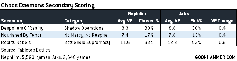In Arks Reality Rebels remains one of the game's strongest secondary objectives, with players averaging 12.2 VP per game when taking it - and doing so in 92% of games. If there's a downside to this secondary it's that it clashes with Behind Enemy Lines, but as a superior scoring option it's a tradeoff Daemons players make gladly. Nourished by Terror remains the odd man out here, while Despoilers of Reality sees occasional play with above-par average results.