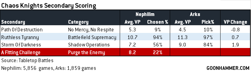 Ruthless Tyranny continues to be an every game pick for the faction and one of the game's strongest secondaries, but Storm of Darkness now essentially fills a similar role. It's 1.9 average VP better thanks to the 4 VP tweak in Arks that makes it possible to score 15 for it and now sees play in 84% of games. This one-two punch gives Chaos Knights a solid path to secondary scoring while the change to Grind Them Down makes it an attractive third pick for the army in many games.
