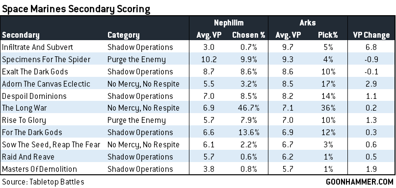 The one major area CSM scoring improved was on their Shadow Operations secondary objectives - Infiltrate and Subvert and Despoil Dominions both became significantly easier to score, with actions that finish at the end of the turn. This makes them much more reliable and in fact makes both adequate replacements for Raise the Banners, netting an average of 2.1 and 0.6 VP over banners, on average.
