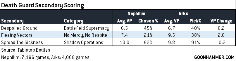 Spread the Sickness is just as good here as it was and pretty much an auto-take for Death Guard, while the improvements to Fleeing Vectors makes it worth consideration in armies that go heavy on plague weapons and can rack up kills. Despoiled Ground got a slight tweak, but not enough to make it worth consideration for most games as it's still very much a "win more" secondary.