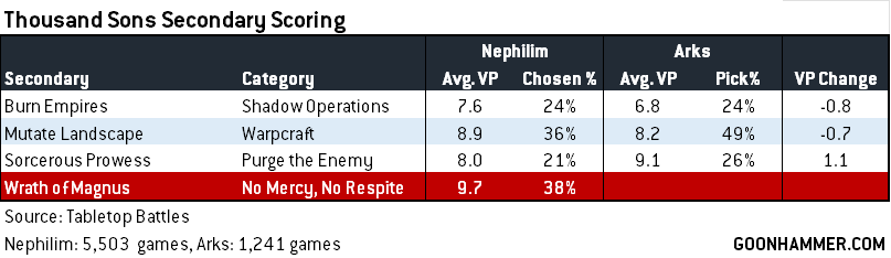 Wrath of Magnus wasn't an all-the-time secondary, but with an average VP score of 9.7, it was dynamite in those top-level matchups where it was available. Interrogation also went down an average of 2 VP per game and as a replacement Warp Ritual has a similar average but a lower cap, making it harder to compete with top armies which can score 100 per game. To add insult to injury, Mutate Landscape also got harder. Sorcerous Prowess saw a bit of an uptick, but that's mostly a result of armies being forced to focus on it in most games.World Eaters