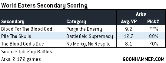 Those are some damn good secondaries, and it's easy to see how World Eaters managed to make an immediate impact despite being a melee-only army. Pile the Skulls is possibly the most inevitable secondary objective in the game, worth a staggering 12.7 VP on average and picked in 88% of games by World Eaters players. When you're winning, you blow extra points to score it. When you're losing, you have extra points to score it. The only question is usually the last few points.