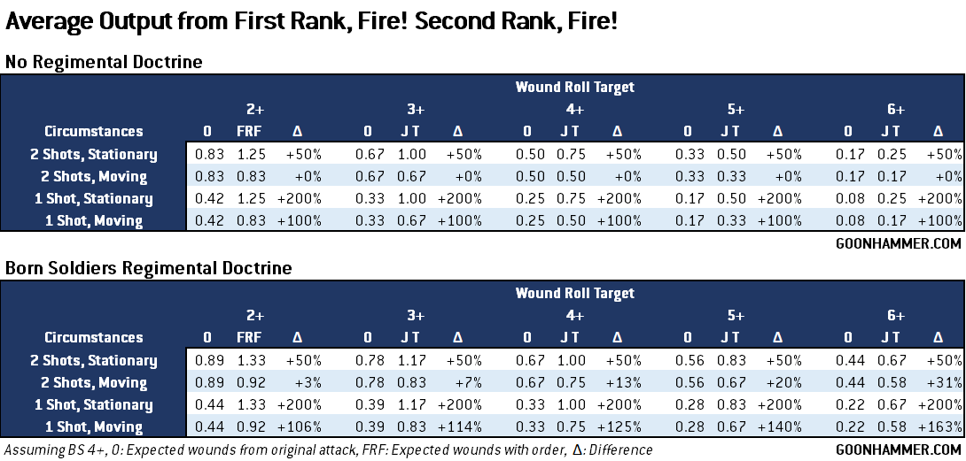 This Order (which will I abbreviate as FRF from now on) changes the Type of all lasguns and hot-shot lasguns from Rapid Fire 1 to Heavy 3. In addition to making the Parade Drill Regimental Doctrine hot garbage, this ability will considerably improve the output of the affected unit by modifying the number of shots (which is a driving modifier as opposed to a gatekeeper like a hit roll). The chart shows the effect below, both for a baseline as well as the default Born Soldiers Regimental Doctrine. Note the synergy between the order and doctrine against heavier targets, where even when moving the order can provide a massive bonus against hard to wound targets.