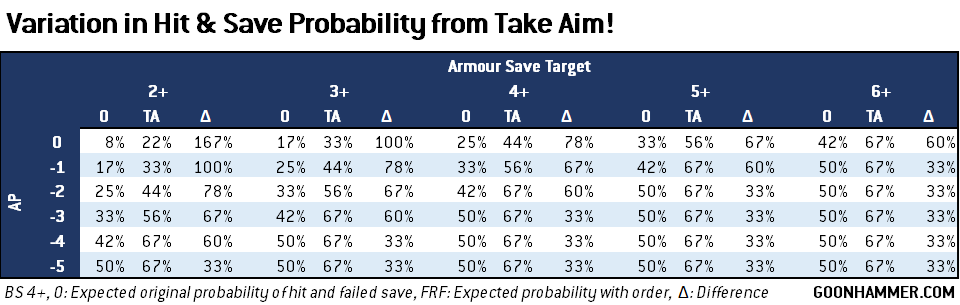 This Order boosts the hit roll and AP an attack by 1. Where FRF only works on lasguns and hot-shot lasguns, Take Aim! works on all ranged attacks. The cumulative effect is significant when the target gets to make a save, with at least a 60% improvement in the probability of getting past the hit and save rolls. Even just boosting BS 4+ to 3+ isn't too shabby on its own.