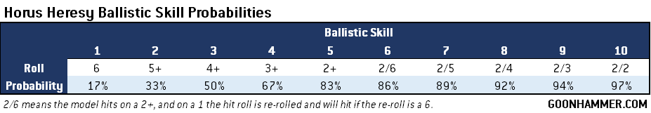Horus Heresy uses a legacy BS/WS system which differs from the check-focused attributes that 8th and 9th edition have used. Instead you reference a chart to find out what your target number is. For the most part the probability to hit is simply 7 - BS, but high levels include an innate re-roll with a different target number on the re-roll. For example a BS of 7 will hit on a 2+, and if the hit roll is a 1 then the player will re-roll and can hit on a 5+. In the event of a special rule that provides a re-roll then the chance of hitting with the re-roll is the same as the first roll.