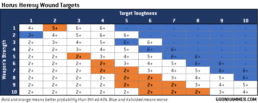 Horus Heresy uses a chart to determine the probability of wounding a target based on the relationship between the Strength characteristic of the incoming attack and the Toughness characteristic of the target. While it appears similar to the wound rolls of 9th edition 40k, there are subtle differences which players may want to take note. First, there is a toughness level beyond which an attack has no hope of wounding. Second, as the Strength characteristic of the attack increases the probability of wounding increases dramatically. The chart below shows the wounding requirements as well as combinations where the probability is worse (italicized purple) or better (bolded orange) when compared to 40k. Attacks in Horus Heresy also receive the Instant Death rule, which states that if the Strength characteristic of the attack is at least double the Toughness characteristic of the target then if the model suffers an unsaved wound it is automatically removed as a casualty.