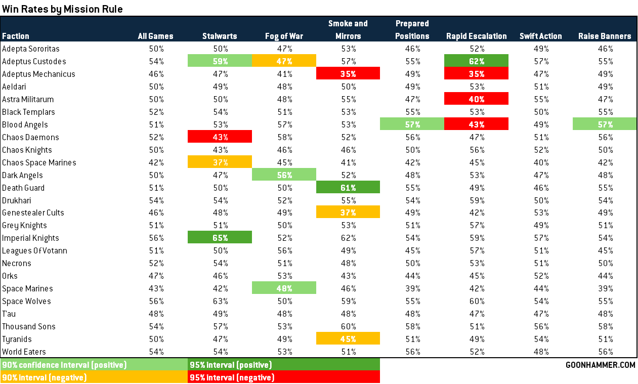 I've gone through and done significance testing for each result in our dataset, comparing the win percentage for each faction with a specific mission rule to its overall win rate (comparing two sample proportions test). Where those results are significant at the 90% and 95% confidence level, I've marked those in the charts below. Because these are two-tailed tests, we're looking for z-scores of 1.96 for 95% and 1.645 for 90%.For this sample, we removed Imperial Agents, Deathwatch, and Emperor's Children. The remaining factions each had at least 400 games played in our sample, and all but Genestealer Cults and Drukhari put up 100+ games per mission rule.