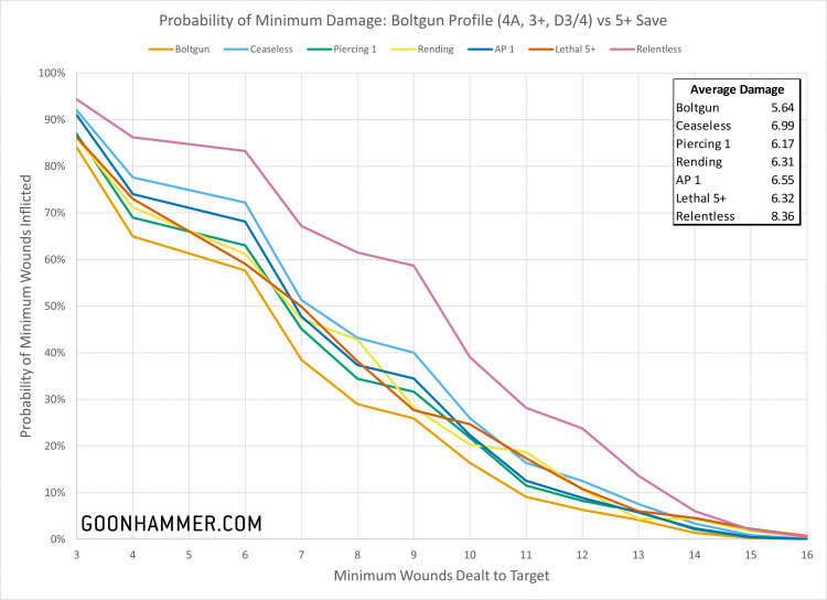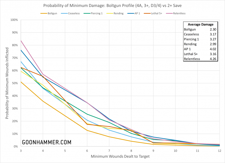We took a look at the distribution and mean damage dealt to a target with a 5+ save (Ork equivalent) and a 2+ save (Custodian). For a lightly armored target re-rolling the hit roll is the strongest approach, with the ability to re-roll results of 1 or 2 from the Relentless ability being the strongest of all and averaging over a full point of damage more than Ceaseless which only re-rolled results of 1. The low Save characteristic of the target made the abilities which focused on critical hits or reducing Defense less effective. In general any bonus is a significant improvement over the baseline bolter, improving the mean damage inflicted by at least 10%.