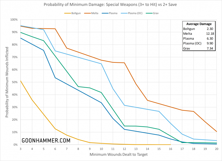 I also thought it might be fun to look at how a few special weapons available to the Astartes would do against a target with a 2+ save. The meltagun has an A4, 3+, 6/3 profile with a 6" range (I refuse to use the dumb symbols), AP 2, and 4MW (meaning it automatically deals 4 mortal wounds on a critical hit). Plasma guns have a 4A, 3+, 5/6 profile with either AP1 or your can supercharge for AP2 but the Hot rule applies (meaning every discarded hit roll of 1 deals 3 mortal wounds to the firer). And then there's the grav-gun, which has a 4A, 3+, 4/5 profile with AP1 and the Grav ability. If the target has a 3+ or better Save characteristic then the grav gun has a Lethal 4+ profile. Ouch.The results below are pretty interesting. If you can get within 6", the combination of mortal wounds and AP 2 means that a meltagun can be absolutely devastating and has a 25% chance of killing even a Custodes in one shot. If the Custodes is wielding a storm shield with a 4+ invulnerable save then things are less impressive. The plasma gun strikes a nice balance between risk and reward, dealing a healthy amount of damage even without the benefit of AP 2. The grav gun is particularly interesting thanks to the ability to get critical hits on a 4+ against heavily armored targets, although the flexibility of the plasma gun may make it more appealing.