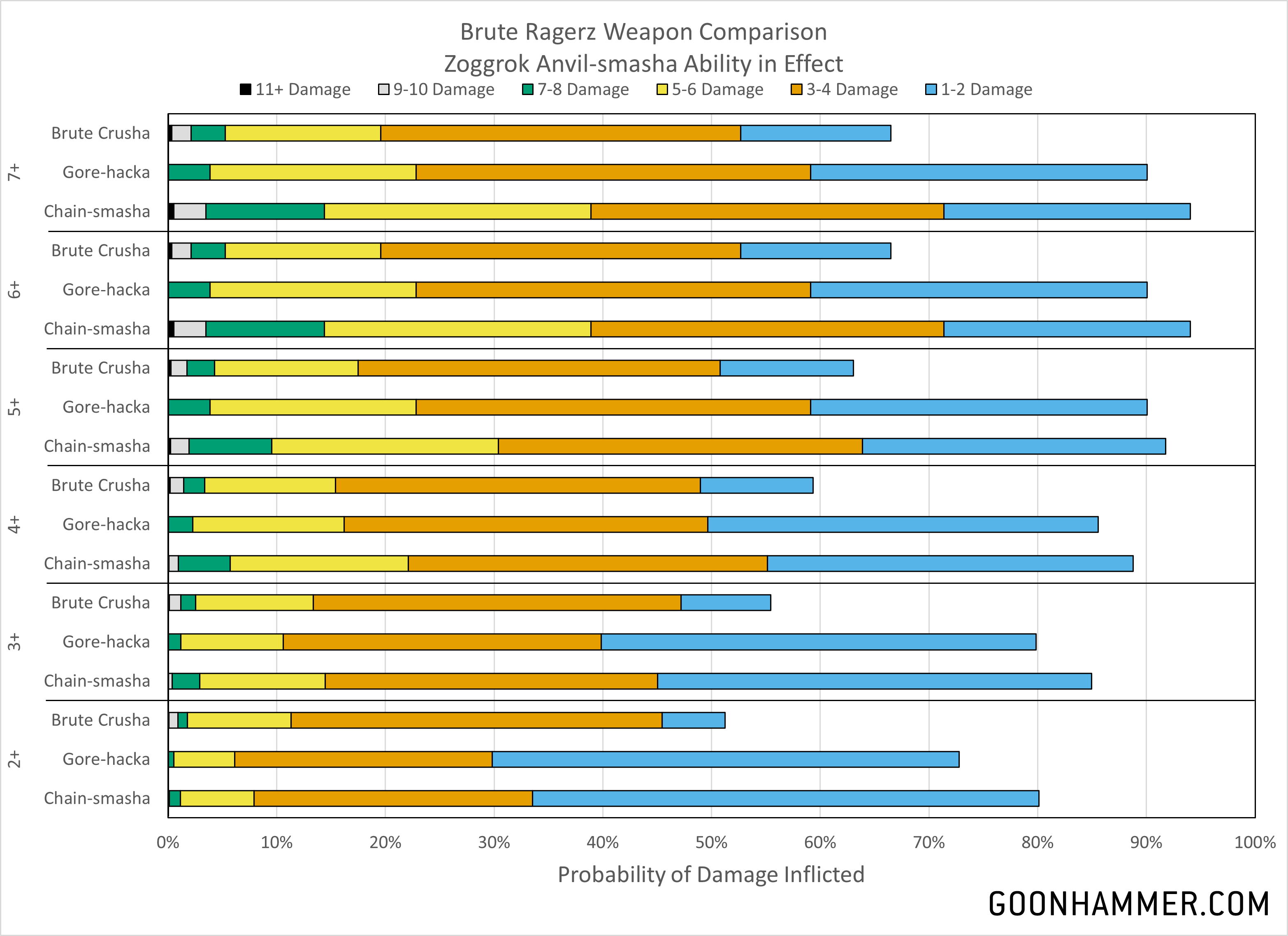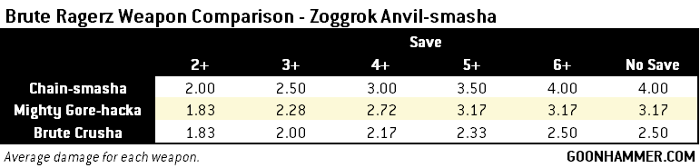 The bonus from Zoggrok flat-out makes the Chain-smasha better in every possible scenario, averaging more damage than the Gore-hacka or the Brute Crusha. The ceiling from the Chain-smasha is also higher than the Brute Crusha outside of when facing 2+ saves. These results show exactly how powerful Zoggrok can be when used on the right weapons.