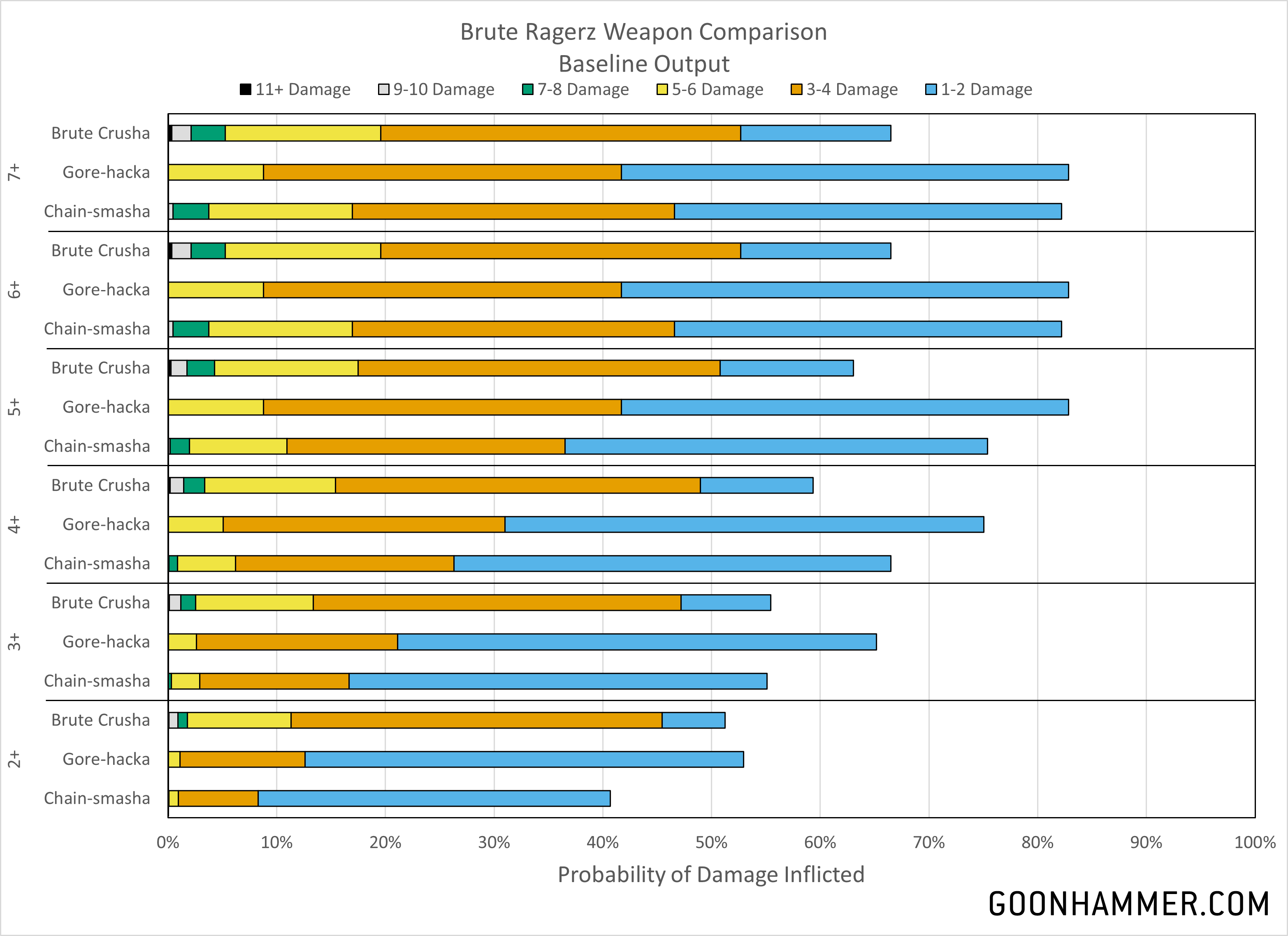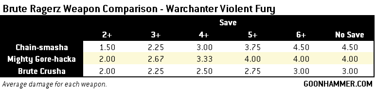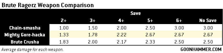The results are pretty interesting. Against heavily armored targets, the Brute Crusha provides more average damage thanks to the high ceiling from the mortal wounds. The Gore-hacka is more effective than the others against targets with a 4+ or 5+ Save, while the Chain-smasha averages the most damage against unarmored targets. This means that the optimal weapon is heavily dependent on the distribution of targets you're trying to kill, although the higher ceiling makes the Brute Crusha particularly appealing.