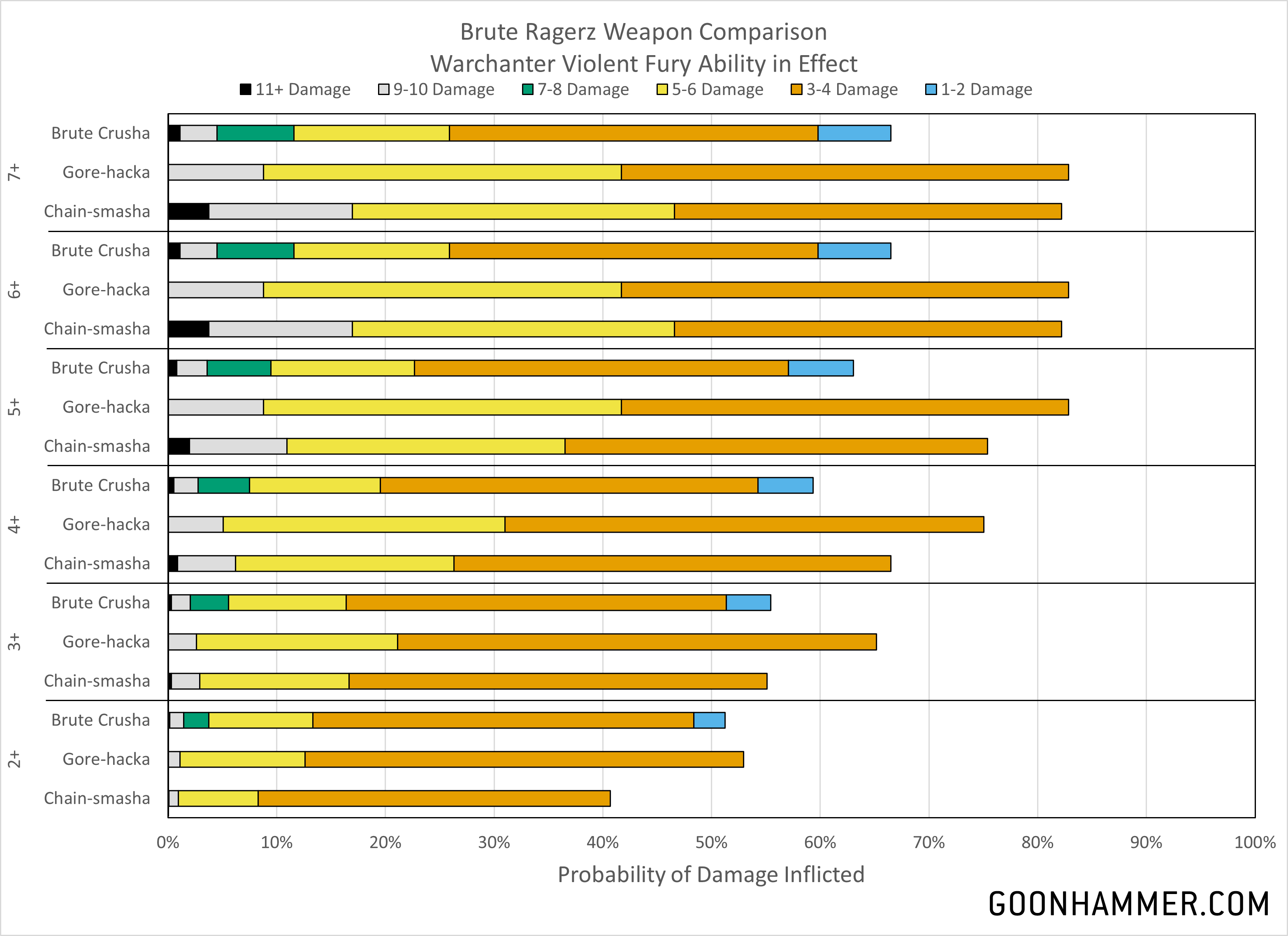 The results show that the optimal weapon to use on Brute Ragerz is heavily circumstantial. In the absence of any modifiers, the Brute Crusha is superior against heavily armored targets and the Chain-smasha is better against lighter foes. The Chain-smasha becomes superior when the unit is improved by Zoggrok Anvil-smasha, while the Gore-hacka is generally preferable when the unit is boosted by a Warchanter. When I first took a look at these numbers I assumed that the Chain-smasha would be preferable in every situation due to the high number of attacks, so it was a pleasant surprise to see that things were more complex than originally thought.Thanks for reading! If you have any questions or comments feel free to drop us a note in the Comments below or email us at contact@goonhammer.com. That’s also the best way to suggest topics for future articles. And if you want regular updates in your inbox, subscribe to our newsletter.