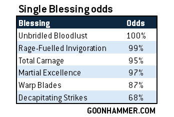 Whenever you roll 8 dice, you're guaranteed to get at least one double - there are only six results, and you're rolling 8 dice. You're also almost guaranteed to get two doubles - it's very rare that you'll get the bad roll: A single triple with every other result being a different value, e.g. (1, 1, 1, 2, 3, 4, 5, 6). These happen about 1.5% of the time and when they occur you only get one blessing of khorne. It sucks.That said, there are times when you only get one blessing on a roll, such as when you use the Skulls for the Skull Throne! Stratagem in the Berzerker Warband Detachment. When that happens, your odds of getting each ability are as follows: