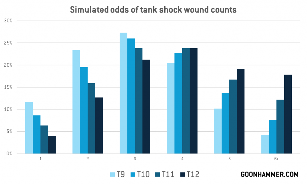 Specifically, at T11, your odds of doing 4+ mortal wounds on the charge are a little more than 50%, and those jump to more than 60% at T12. You can generally count on doing 3+ most of the time, however, as even T9 models have a solid chance of doing 3 or more mortal wounds with Tank Shock, even if your expected value there is 1.5 mortal wounds.