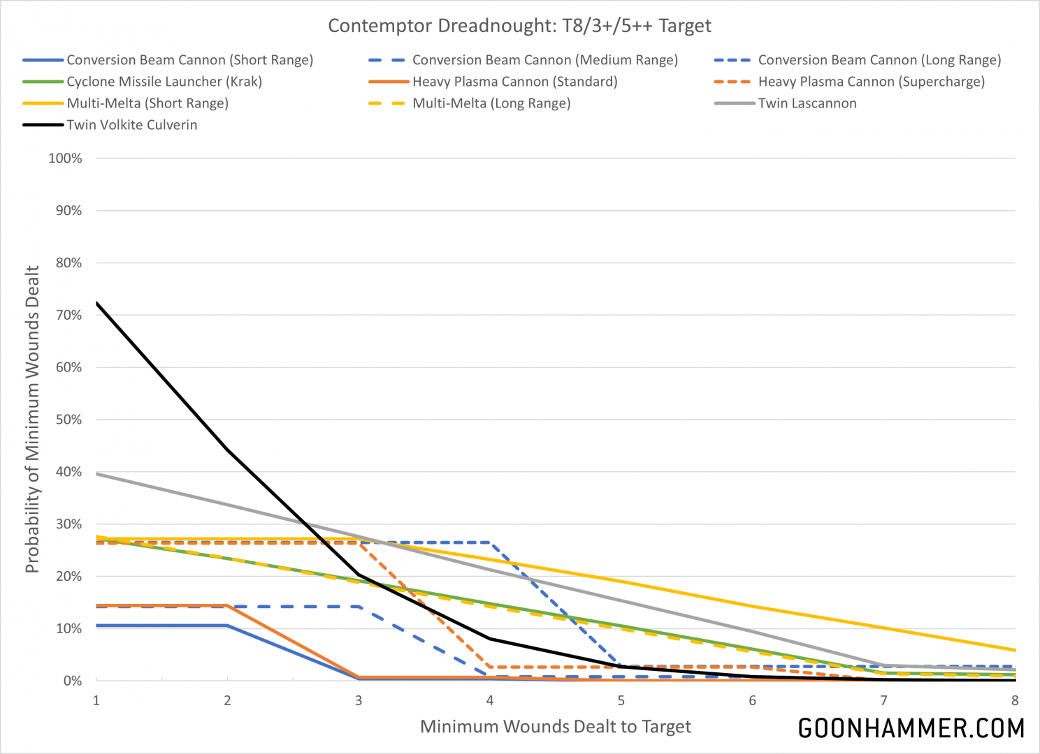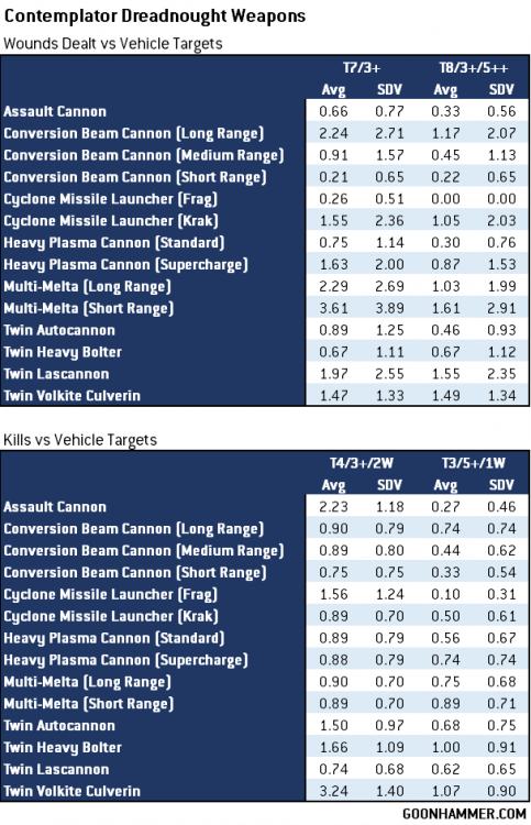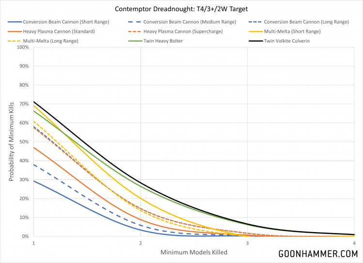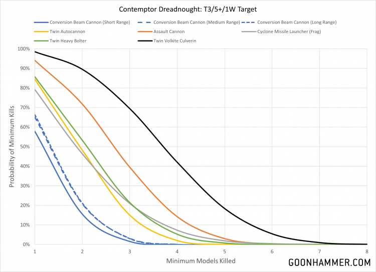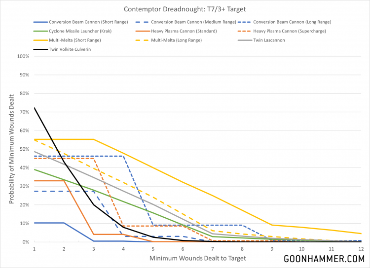 Unsurprisingly the heavy hitters like the lascannon, multi-melta, and long range conversion beamer all perform well in these calculations, but the output of the twin volkite cannon is also something to keep an eye on. The large number of shots and possibility of dealing mortal wounds makes it a very flexible weapon, and comparatively if the target has an invulnerable save that'll cap off the efficacy of the dedicated tank killing weapons. The major takeaway here is that none of these weapons have a great chance of doing a significant amount of damage, with even the short range multi-melta only dealing 8 or more points of damage roughly 5% of the time. As CORE units these Dreadnoughts will definitely benefit from a re-roll aura, particularly re-rolls to wound for the twin volkite culverin.