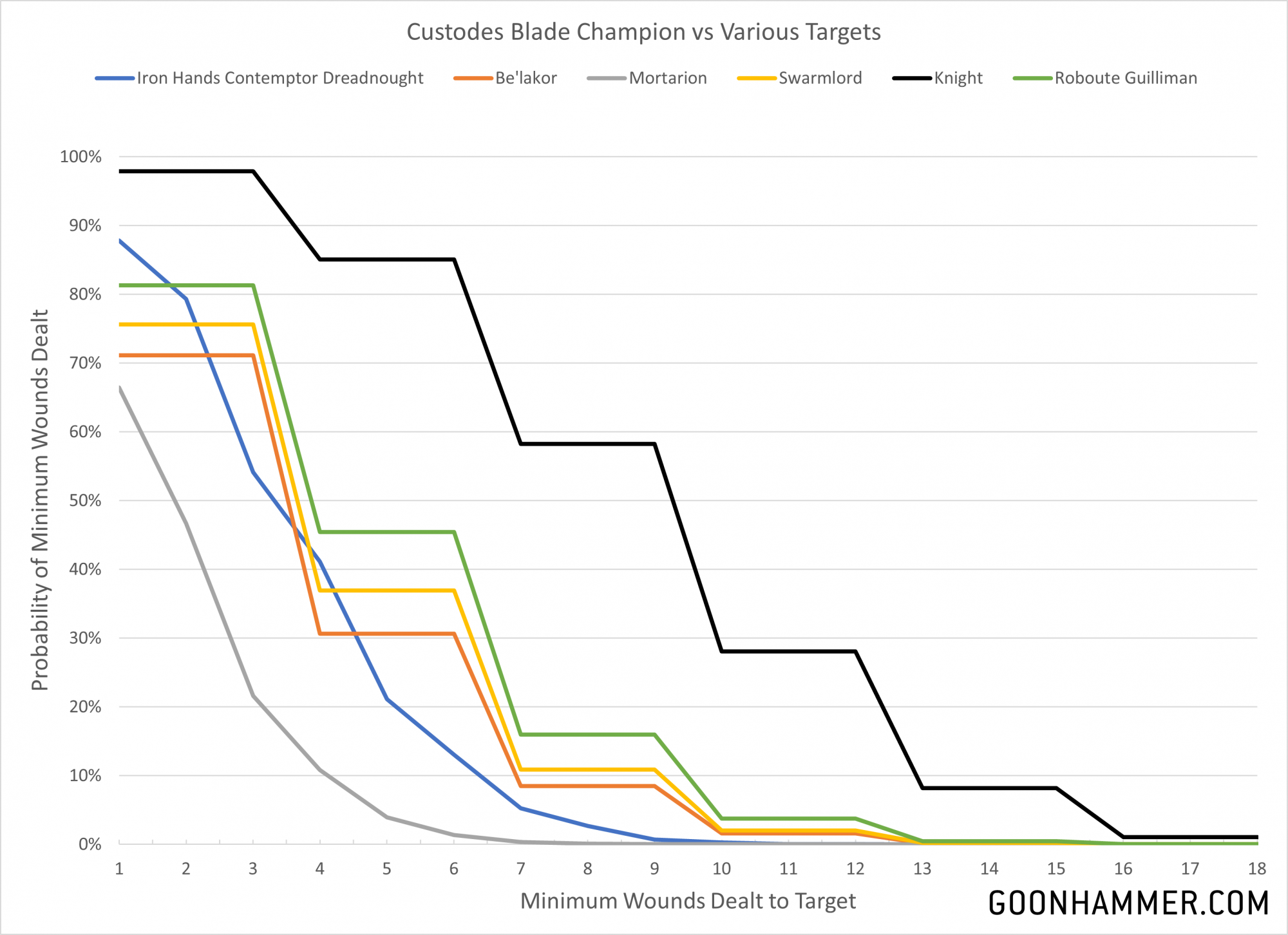 While the Blade Champion is certainly nasty against quite a few targets, he's not likely to do much damage against the really big nasties out there. Whether it be from damage reduction or high invulnerable saves, these hard targets will give the baseline Blade Champion trouble, though in a a way 110 points does seem like a pretty fair bargain to have a 15% chance to kill all 380 points of Roboute before the Primarch can even act. It's also important to remember that these values do not include any of the bonuses or Stratagems that Custodes are guaranteed to get in the new book.