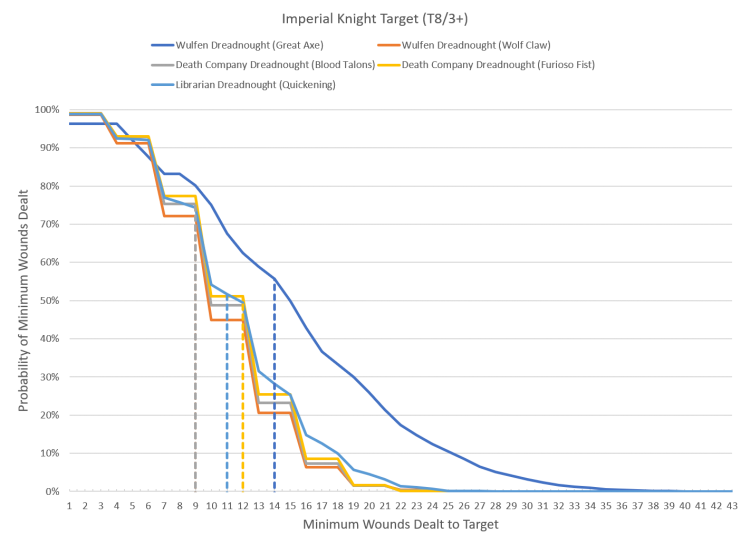 For the chart below we take a look at our old friend; the T8/3+/24W monstrosity that is the Knight. The Wulfen units will use Savage Strike for the wound bonus, while the Librarian Dreadnought will have Quickening active. As with before we'll assume the Assault Doctrine is active.