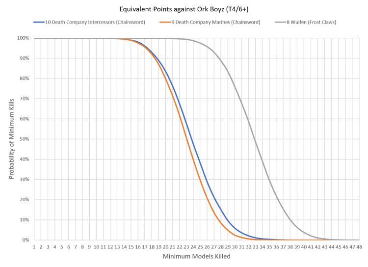 Note that 9 Death Company Marines is only 225 points so the actual number of wounds dealt for an equivalent value of 240 points is about 6% higher, meaning that even with the jump packs the Death Company Marines are better at killing Orks thanks to Descent of Angels. The Wulfen absolutely shred the Blood Angels in the horde clearing department, killing 40% more Orks on average. If you can get them into contact Wulfen are an absolute nightmare.
