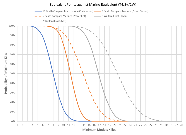 The T4/3+/2W profile is ubiquitous so we might as well use that for our next target. Here the Death Company Intercessors are going to be at a bit of a disadvantage as none of them can take a power weapon if they're all equipped with Astartes chainswords. The Death Company Marines pose an interesting question; is it better to field power fists (35 PPM) and deal 2 damage, or power swords (30 PPM) since the +1S means you'll be wounding on 2s either way? The Wulfen offer a similar question; are you better off with frost claws (30 PPM) or paying extra for the bonus damage of the great frost axe (33 PPM)?